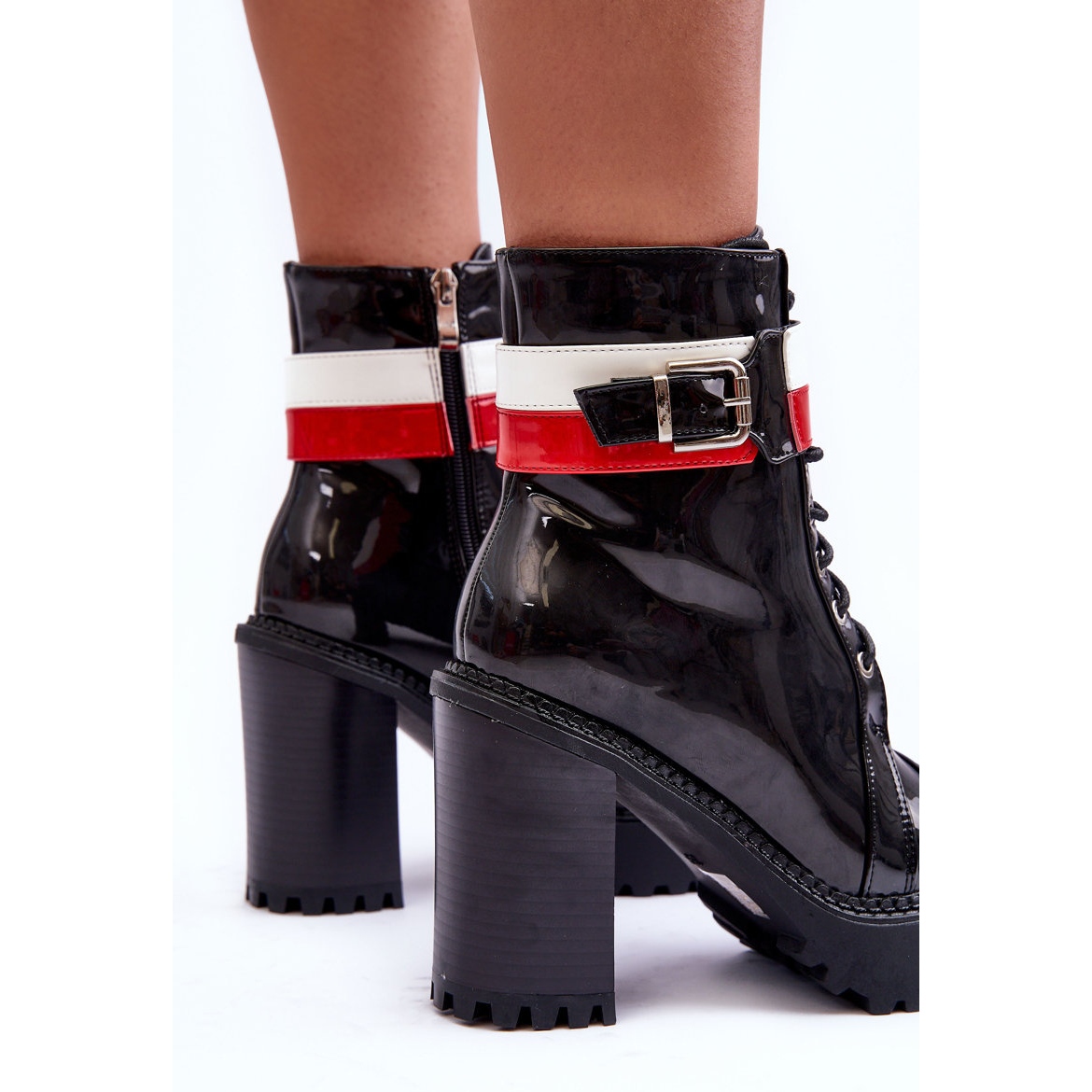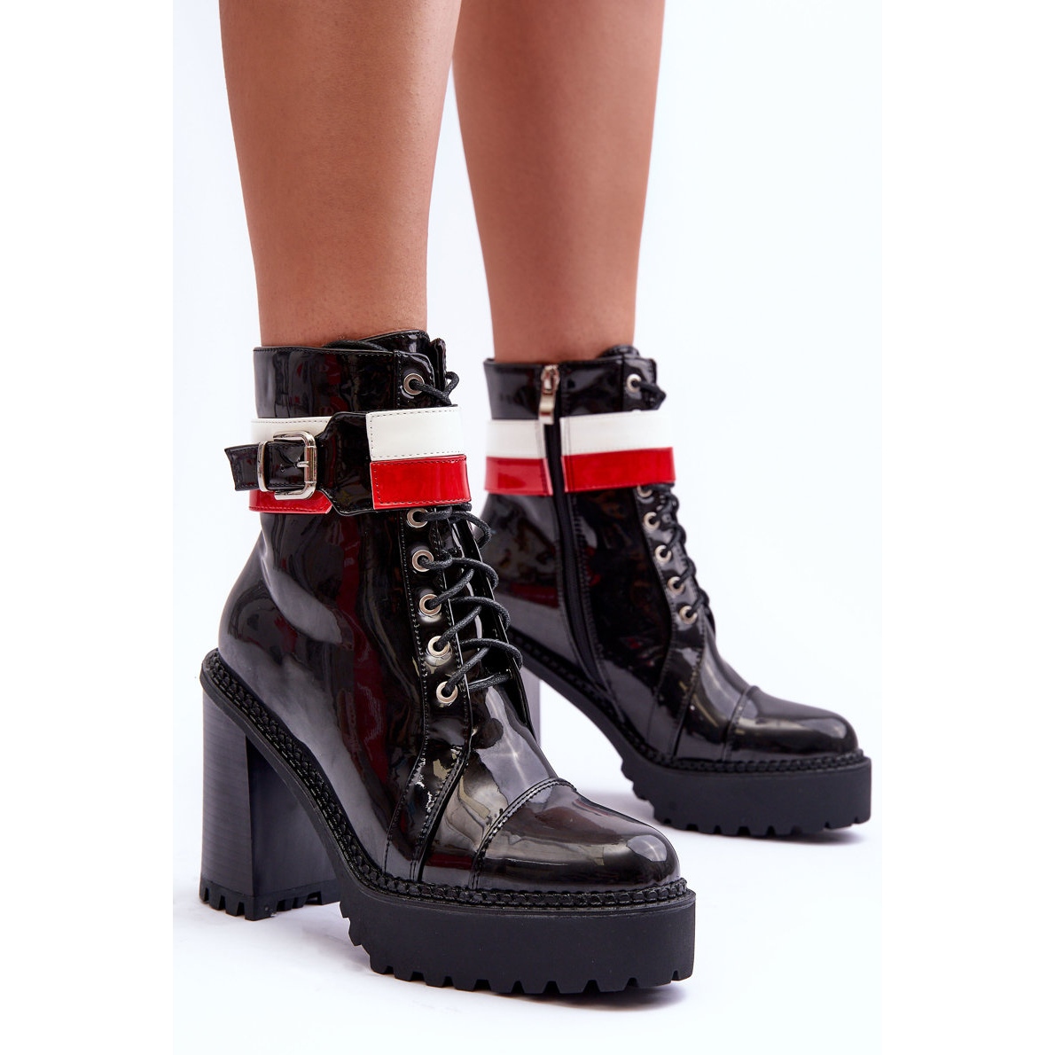 Bottes pour femmes sur une plateforme massive et talons hauts en forme de poteau stable. Fabriqué en cuir écologique. Fermé par une fermeture éclair à l'intérieur de la chaussure et lacé en plus. Le talon est rigidifié. En haut de la tige se trouvent deux sangles reliées. La semelle intérieure en matériau garantira une utilisation confortable des chaussures. Vous devez les avoir ! Lorsque vous choisissez une taille, veuillez utiliser le tableau des tailles.