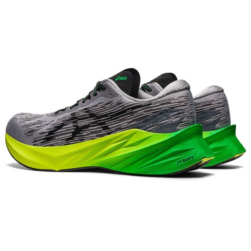 Les chaussures Asics Novablast 3 se distinguent par une couleur grise et verte unique qui attire l'attention. La semelle en caoutchouc garantit une excellente adhérence et l'utilisation de matériaux synthétiques dans la tige rend les chaussures non seulement légères, mais également respirantes, ce qui assure le confort même pendant les séances d'entraînement intenses.