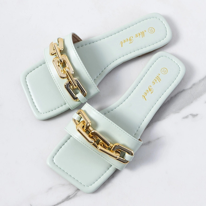 Détails: Babouches élégantes vertes avec une chaîne Cherell