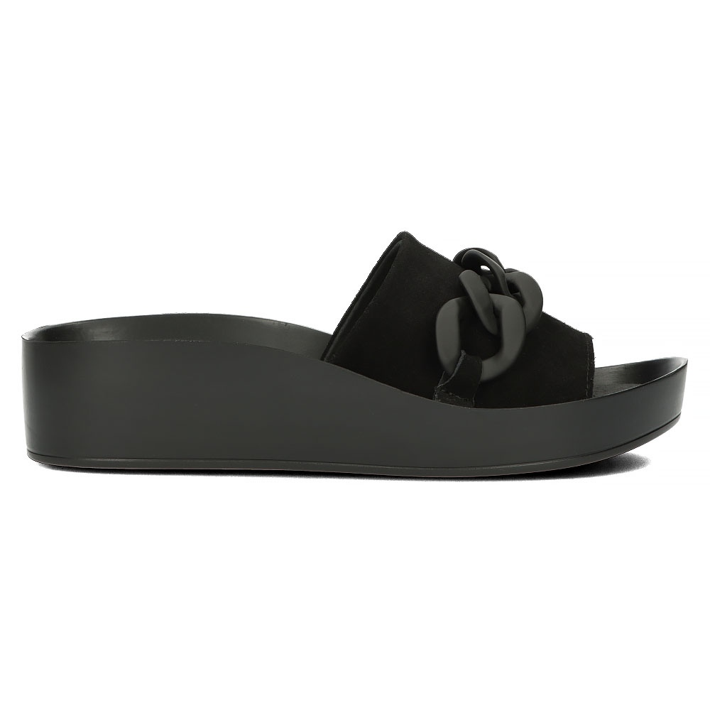Les tongs sont dotées d'une semelle synthétique de 4,5 cm de hauteur qui absorbe parfaitement les chocs, et la forme ronde du bout assure confort et liberté de mouvement. Ils se distinguent également par une chaîne décorative qui leur confère un caractère élégant.