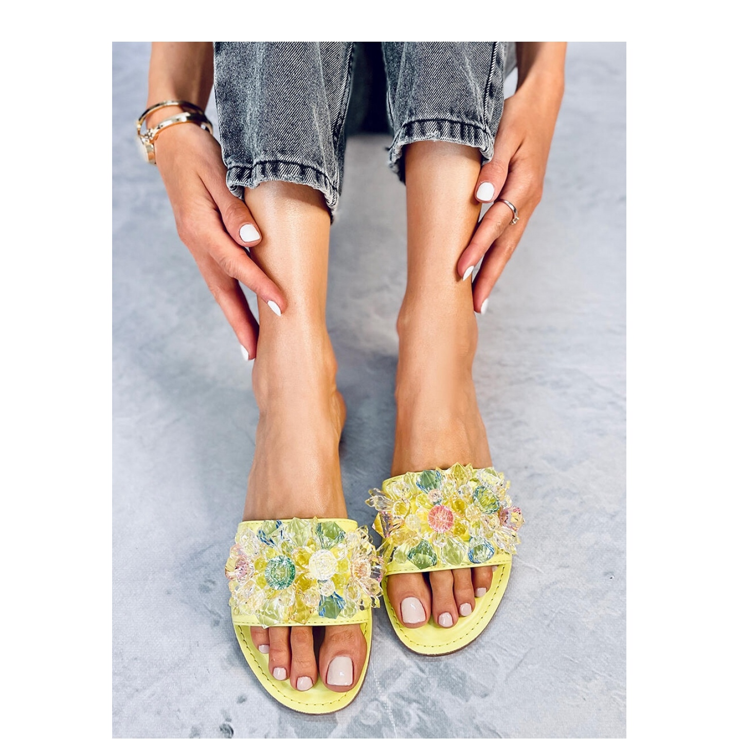Découvrez une élégance et un confort extraordinaires avec les chaussons femme Green en vert ! Ces sandales plates uniques sont le choix parfait pour les femmes qui souhaitent allier style et confort. Une large bande décorée de pierres colorées et brillantes attire l'attention et procure un effet wow en toute occasion.