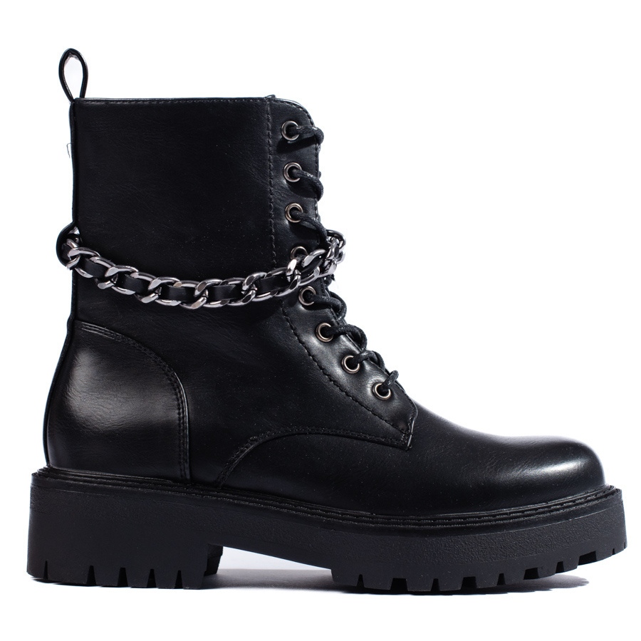 Des travailleurs noirs élégants et confortables, combinant un style décontracté et rock. Fabriqué en cuir écologique, isolé avec une "couverture de chaussures", idéal pour les journées d'automne et d'hiver plus fraîches. La chaîne décorative ajoute du caractère, et la fermeture de zip et de laçage pratique assure une mise en place et une adaptation faciles au pied.