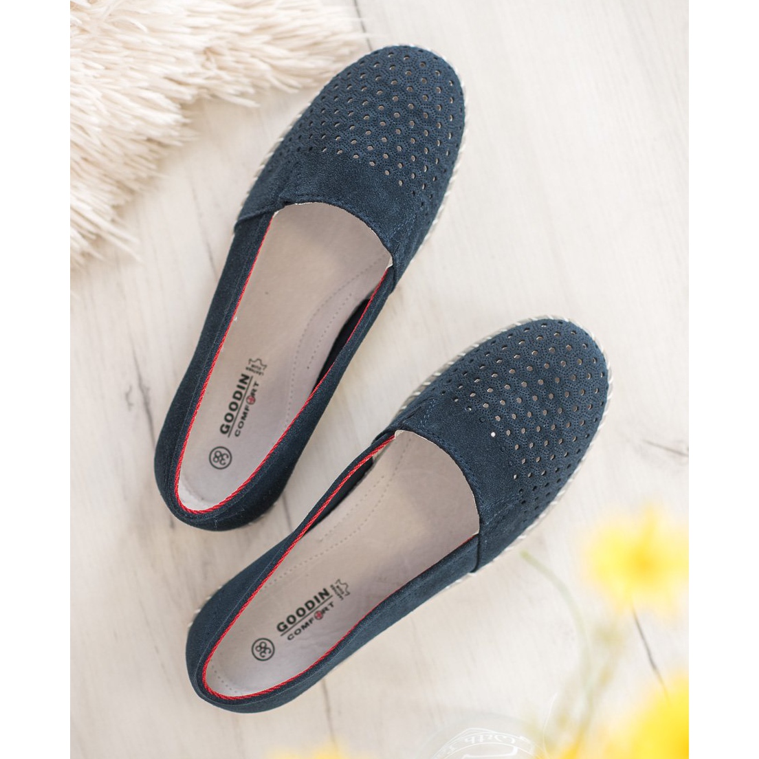 Découvrez l'élégance et le confort avec les ballerines bleues Goodin ! Ces chaussures pour femme allient design moderne et confort d'utilisation, s'adaptant parfaitement au style décontracté. Fabriqués en cuir naturel de haute qualité, ils se caractérisent par un motif ajouré qui ajoute fraîcheur et légèreté.