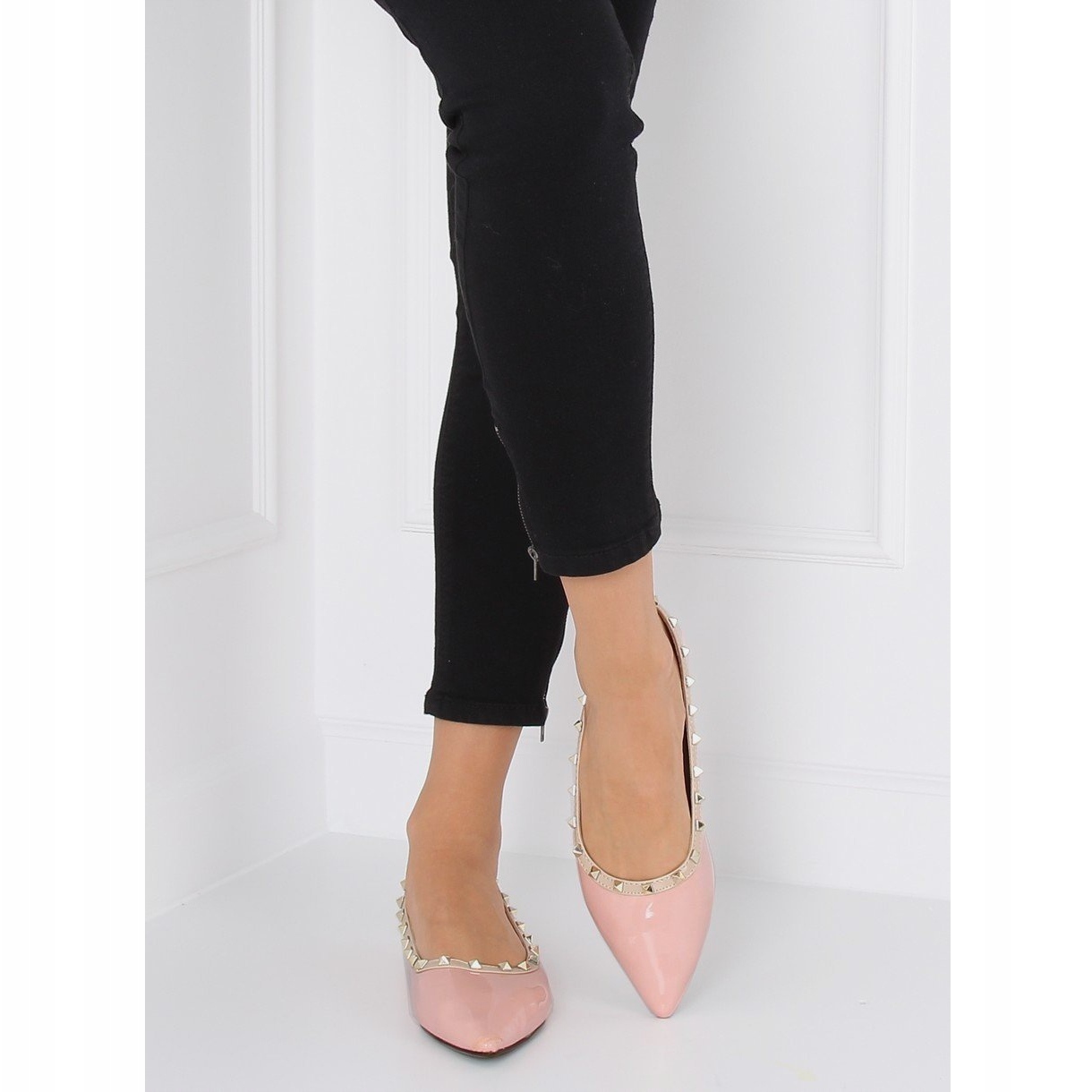 Nous vous présentons des ballerines à clous d'une charmante couleur rose, modèle 127-16 Pink, qui complètent parfaitement tout style de tous les jours. Fabriquées en cuir écologique de haute qualité, ces chaussures pour femmes impressionnent par leur finition vernie et leur bout subtil en amande avec une pointe délicate qui donne au pied un look élégant.