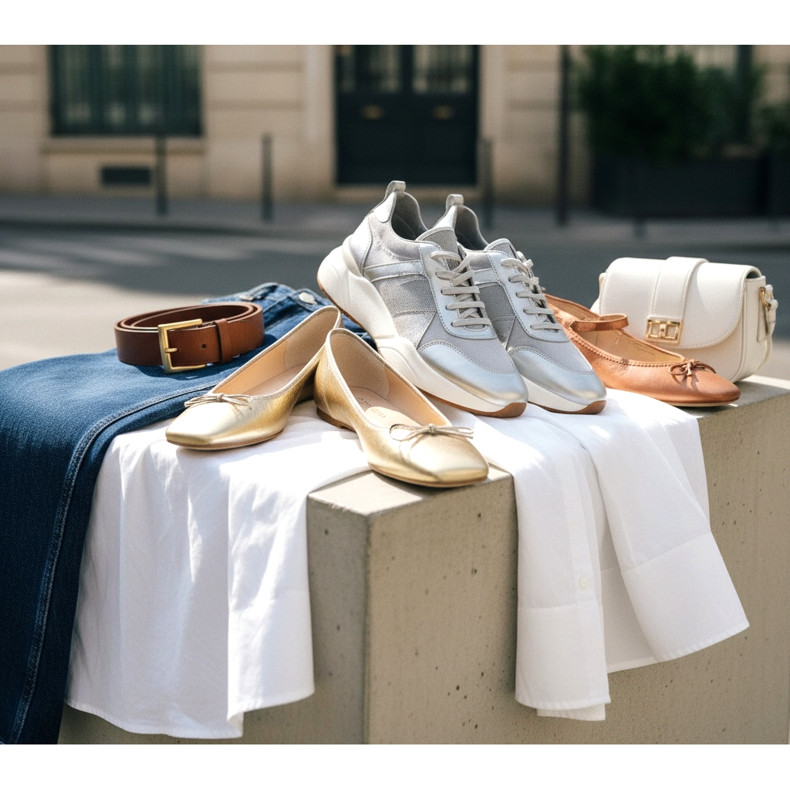Essayez des chaussures plates dorées avec un denim foncé et une simple chemise blanche. Ajoutez une ceinture en cuir et un sac à main minimaliste : l'effet est étonnamment luxueux tout en étant totalement confortable. Les ballerines argentées complètent parfaitement les styles monochromes en gris et blanc.