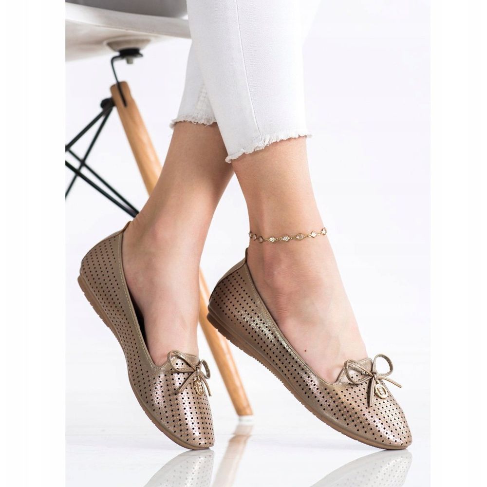 Nous vous présentons les ballerines ajourées avec nœud de Vinceza dans une belle combinaison de couleurs beige et or. Ce sont des chaussures élégantes et pratiques qui s'adapteront aussi bien au quotidien qu'aux occasions spéciales.