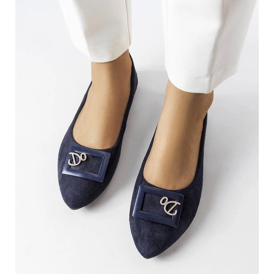 Le produit décrit est "Ballerines bleu marine avec strass bleu Fleming" - ce sont des chaussures pour femmes appartenant à la catégorie ballerines. Les chaussures sont en cuir suédé écologique de teinte bleu marine, et leur semelle intérieure est en cuir écologique. Les ballerines sont basses, avec une hauteur de chaussure de 7 et un petit talon/orga de 1. Elles se caractérisent par des zircons brillants placés à leur surface.