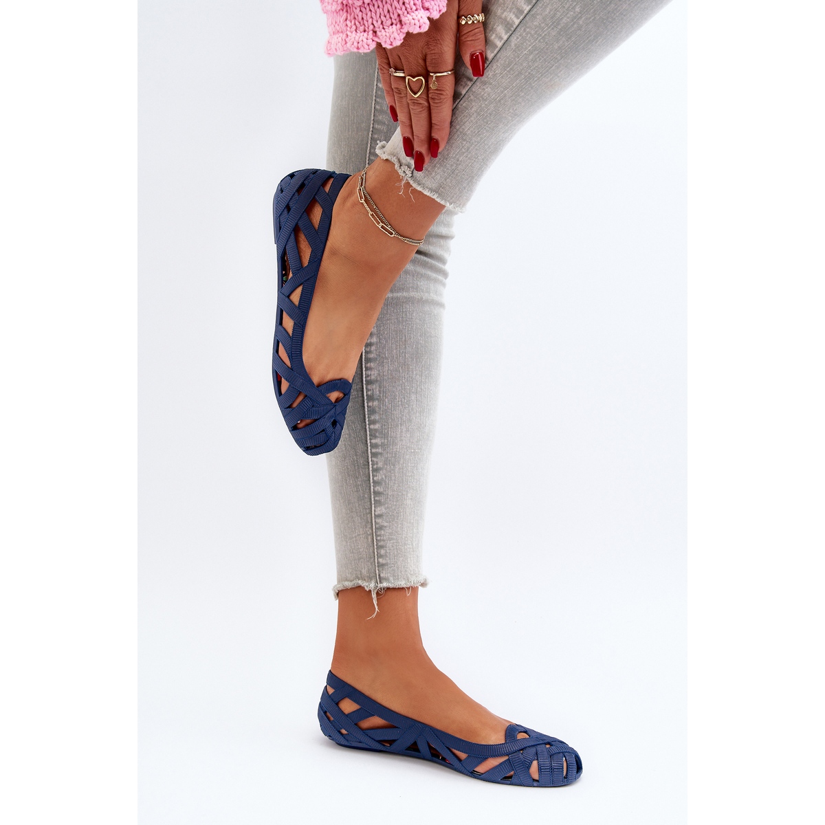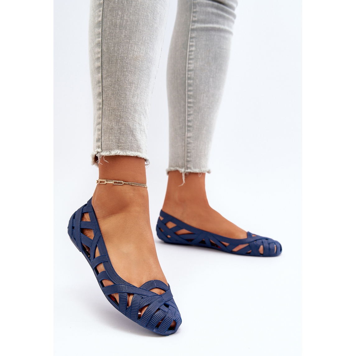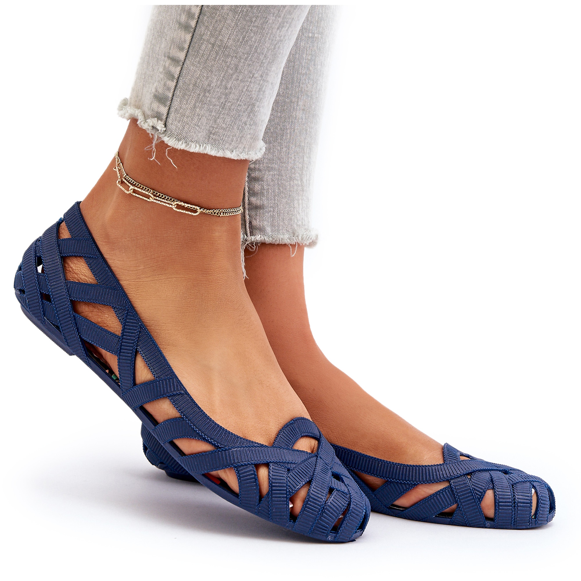 Nous vous présentons des ballerines en caoutchouc pour femmes dans une belle couleur bleu marine, qui seront un choix parfait pour les journées d'été. Le modèle Salam est une combinaison de fonctionnalité et de style, fabriqué dans un matériau en caoutchouc de haute qualité, qui assure un confort de port et une facilité de nettoyage. Le design ajouré avec des rayures entrelacées ajoute de la légèreté et de l'élégance, ce qui les rend parfaitement adaptés à différents styles.