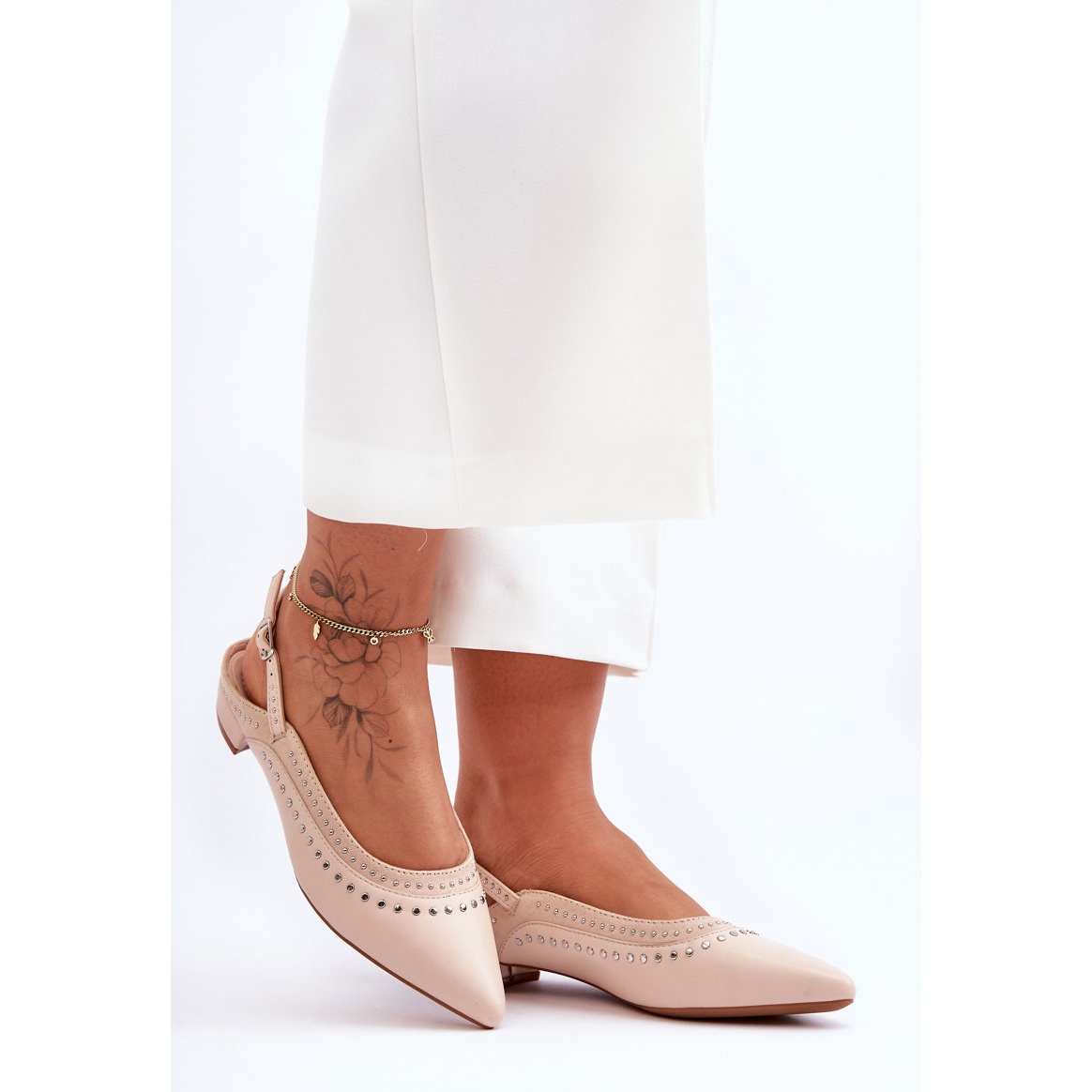 Les ballerines ont un talon ouvert et un bout pointu tendance, ce qui leur confère légèreté et subtilité. Fabriqués en cuir écologique de haute qualité, ils garantissent non seulement un look élégant, mais aussi une durabilité. Les clous décoratifs ajoutent du caractère et la bride réglable avec boucle assure un ajustement parfait au pied.