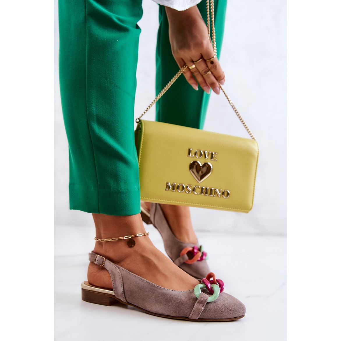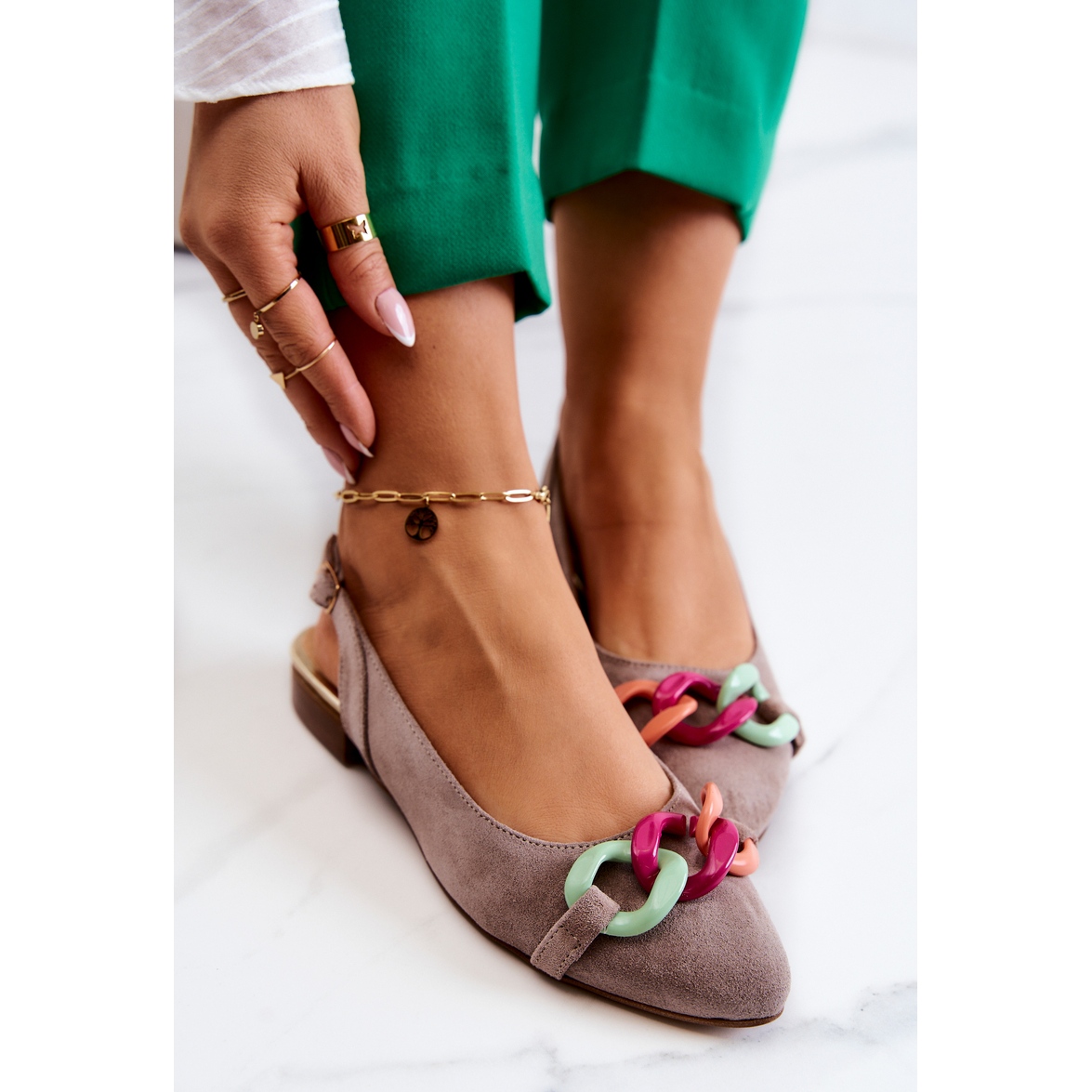 Les ballerines ont un bout pointu caractéristique qui met parfaitement en valeur la silhouette féminine. Sur le devant se trouve une jolie chaîne en plastique, qui leur donne un caractère original et attire l'attention. Une fine bride de cheville réglable avec boucle assure un ajustement parfait et un soutien supplémentaire.