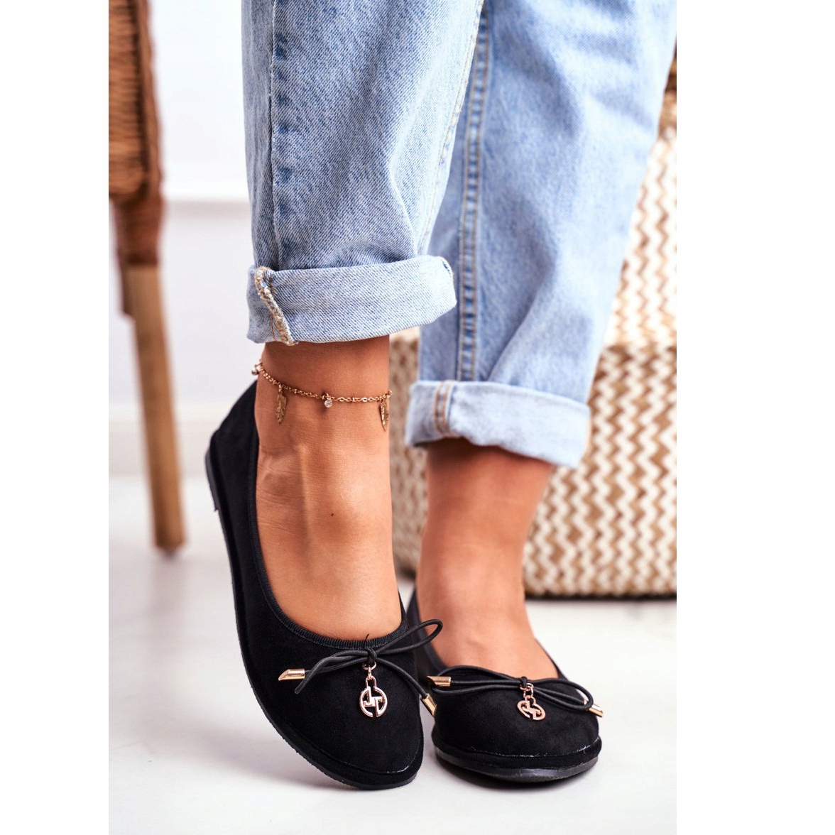 Fabriquées en éco-daim de haute qualité, les ballerines sont extrêmement élégantes et leur couleur noire les rend faciles à assortir à diverses tenues. Les éléments dorés ajoutent de la classe et vous font sentir exceptionnellement féminine. Le nez rond et le nœud sur le devant sont des détails qui leur confèrent un charme subtil.