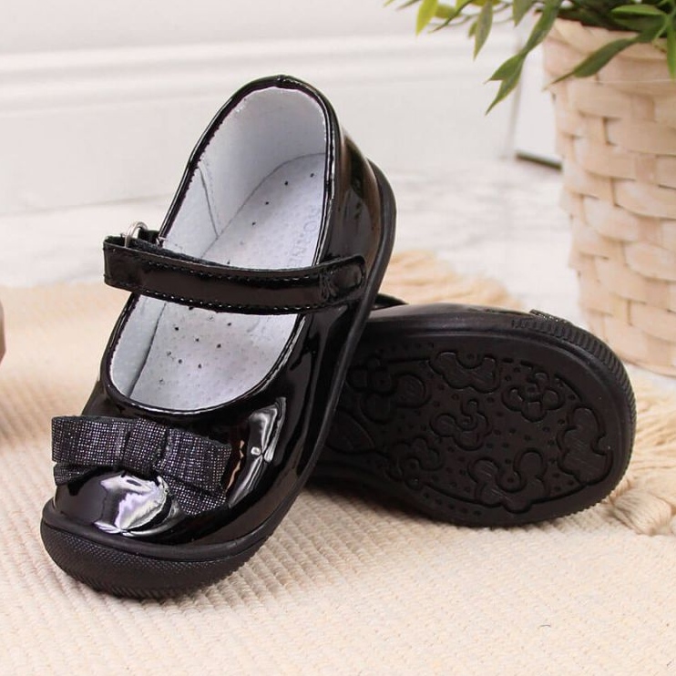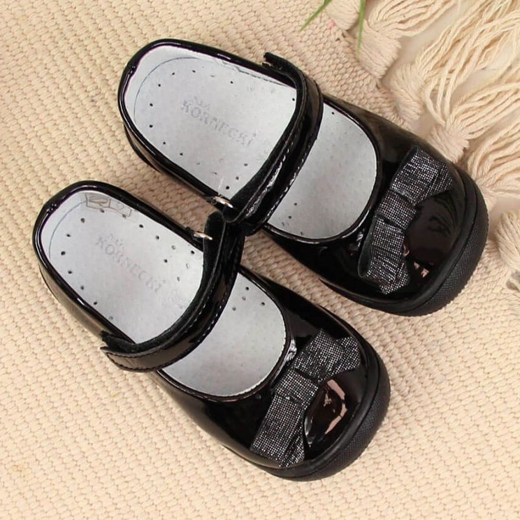 Nous vous présentons des ballerines pour filles élégantes et confortables avec fermeture scratch verni, noires, de la célèbre marque Kornecki. Ces chaussures uniques sont parfaites pour un usage quotidien, offrant un look tendance et un confort de port.