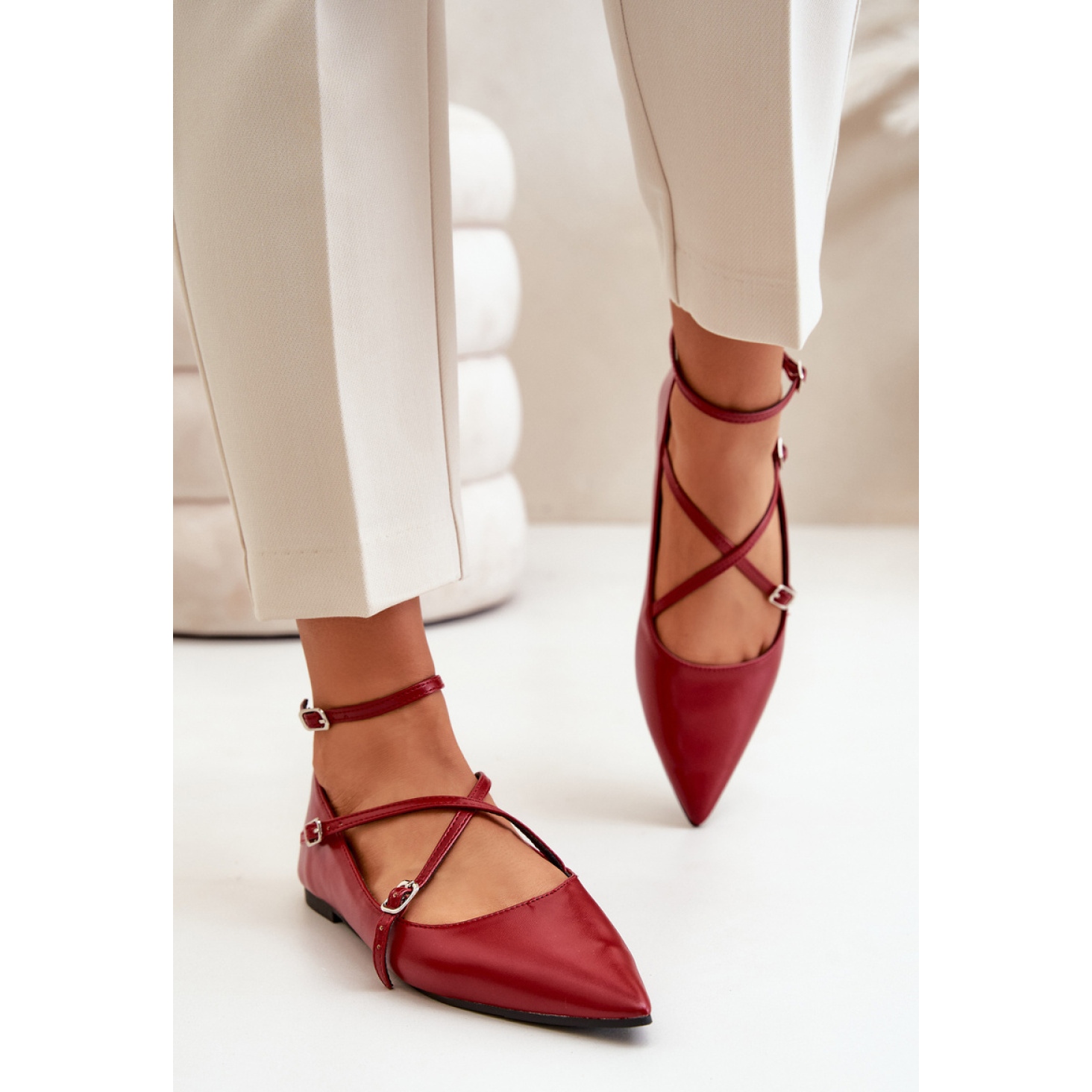 Ballerines pour femmes en cuir écologique. Attaché autour de la cheville par une bride réglable, qui assure un ajustement parfait au pied. Monté sur un talon plat. Les bouts pointus affineront optiquement vos jambes. La semelle intérieure souple assurera le confort à chaque pas. Ce modèle se distingue par de fines bretelles entrelacées avec une boucle. Un modèle extrêmement tendance qui devrait être dans votre garde-robe !