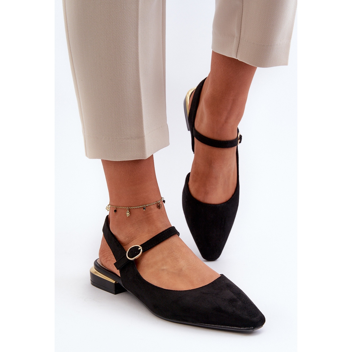Les ballerines sont également équipées d'une boucle qui permet un ajustement rapide et sans problème aux besoins individuels de l'utilisateur. Le matériau extérieur - le cuir suédé écologique - allie élégance et respect de l'environnement, ce qui fait de ces chaussures un choix pour un client conscient et écologiquement responsable.