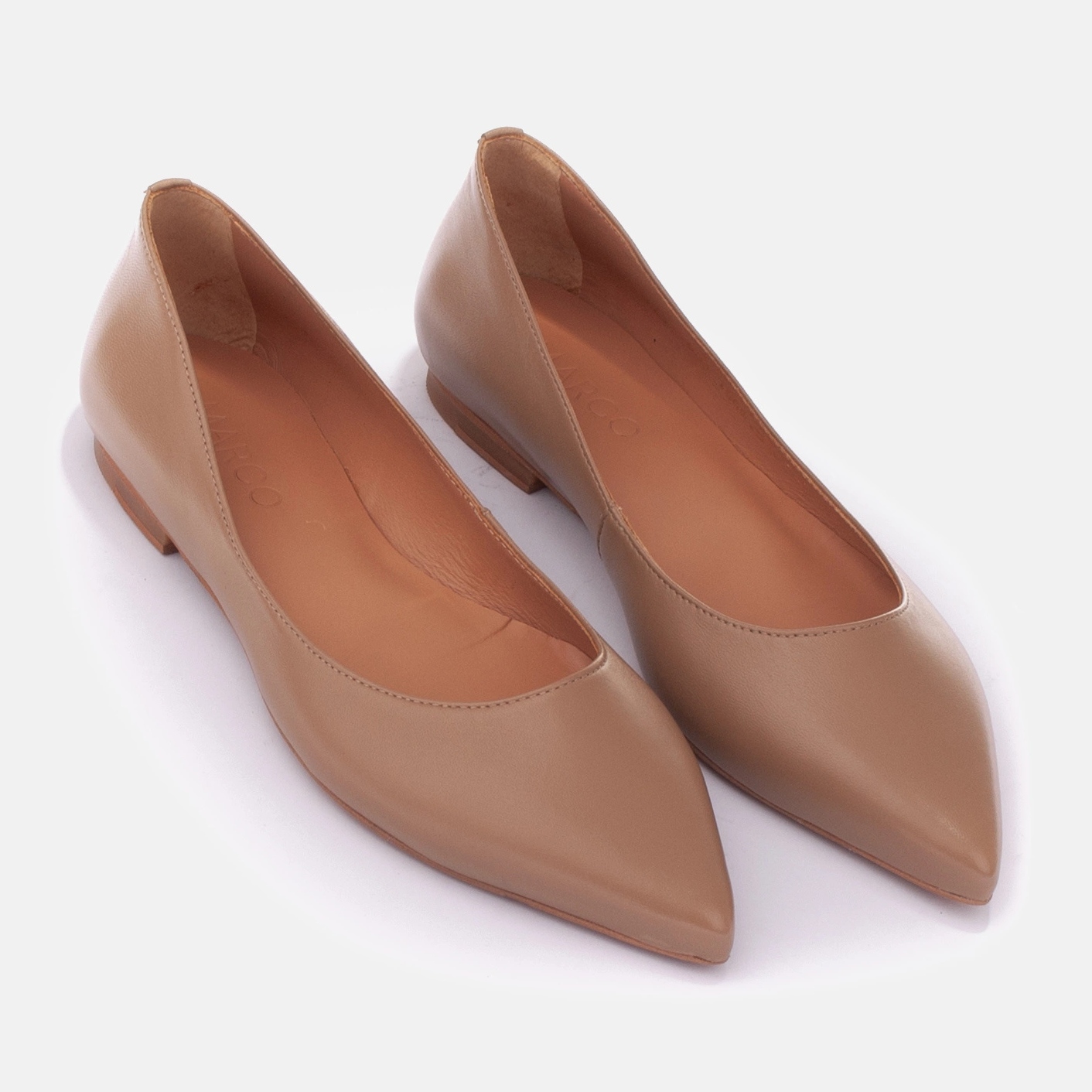 Élégant, simple et extrêmement confortable - ces ballerines de chaussures beige marco sont cousues de cuir de chèvre de haute qualité, qui se distingue par la douceur, l'élasticité et l'éclat naturel. La forme classique avec un nez pointu légèrement allongé et une ligne de décolleté approfondie optiquement le pied, et la couleur délicate et neutre met l'accent sur la nature universelle des chaussures.