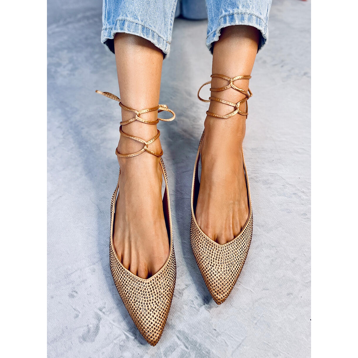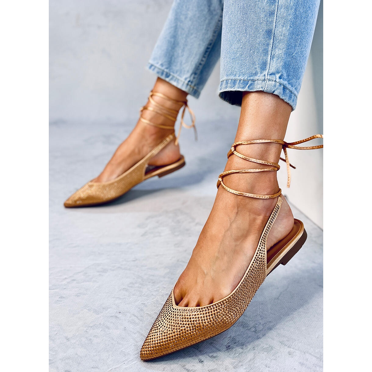 Découvrez l'éclat de l'élégance moderne - Les ballerines Vonda Champagne avec strass et talon ouvert sont un modèle qui séduira les femmes qui apprécient la combinaison d'un look raffiné et de confort. Ces chaussures à lacets dorées exceptionnellement élégantes sont le complément parfait aux tenues de tous les jours et aux tenues plus élégantes.