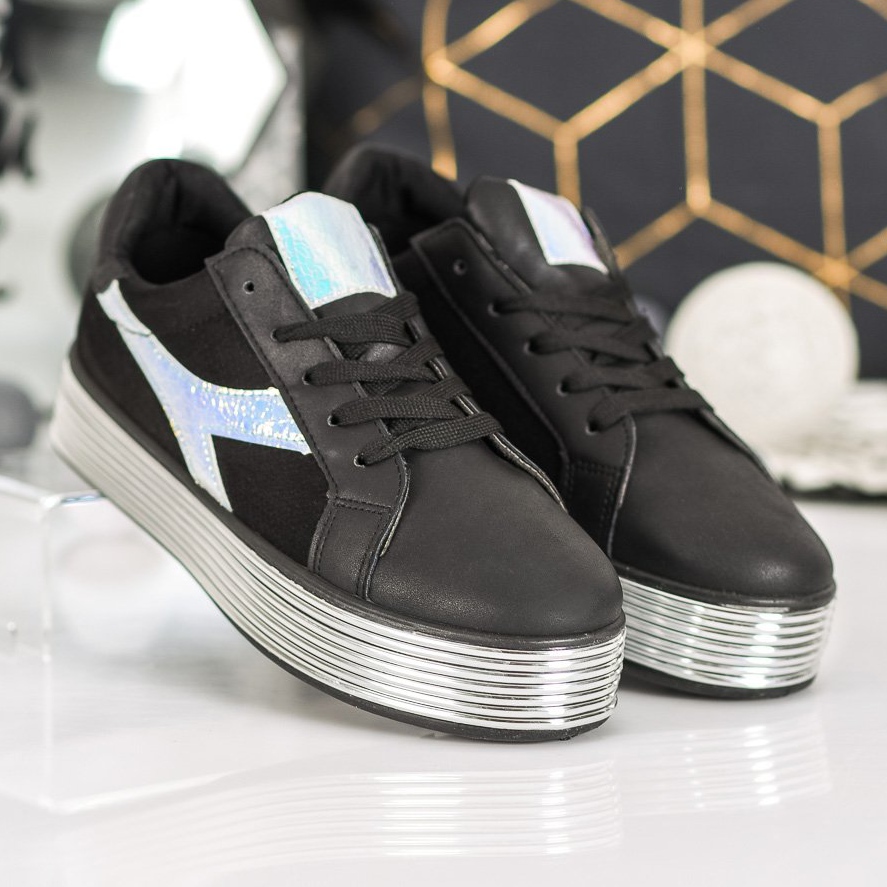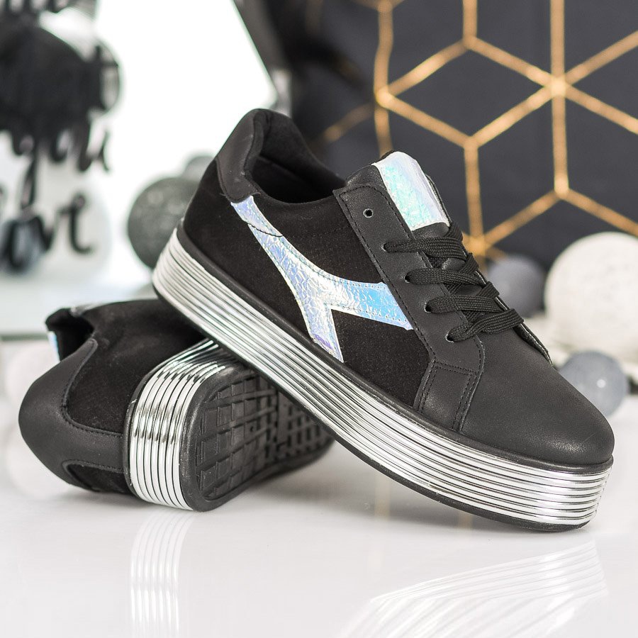 Nous vous présentons les baskets noires pour femmes à effet holographique de la marque Ideal Shoes - un excellent choix pour les femmes qui apprécient le style et le confort. Ces chaussures modernes se distinguent par des inserts holographiques qui leur confèrent un caractère futuriste, ce qui les rend parfaites comme complément tendance à de nombreux styles du quotidien.