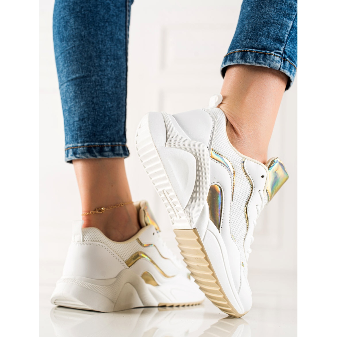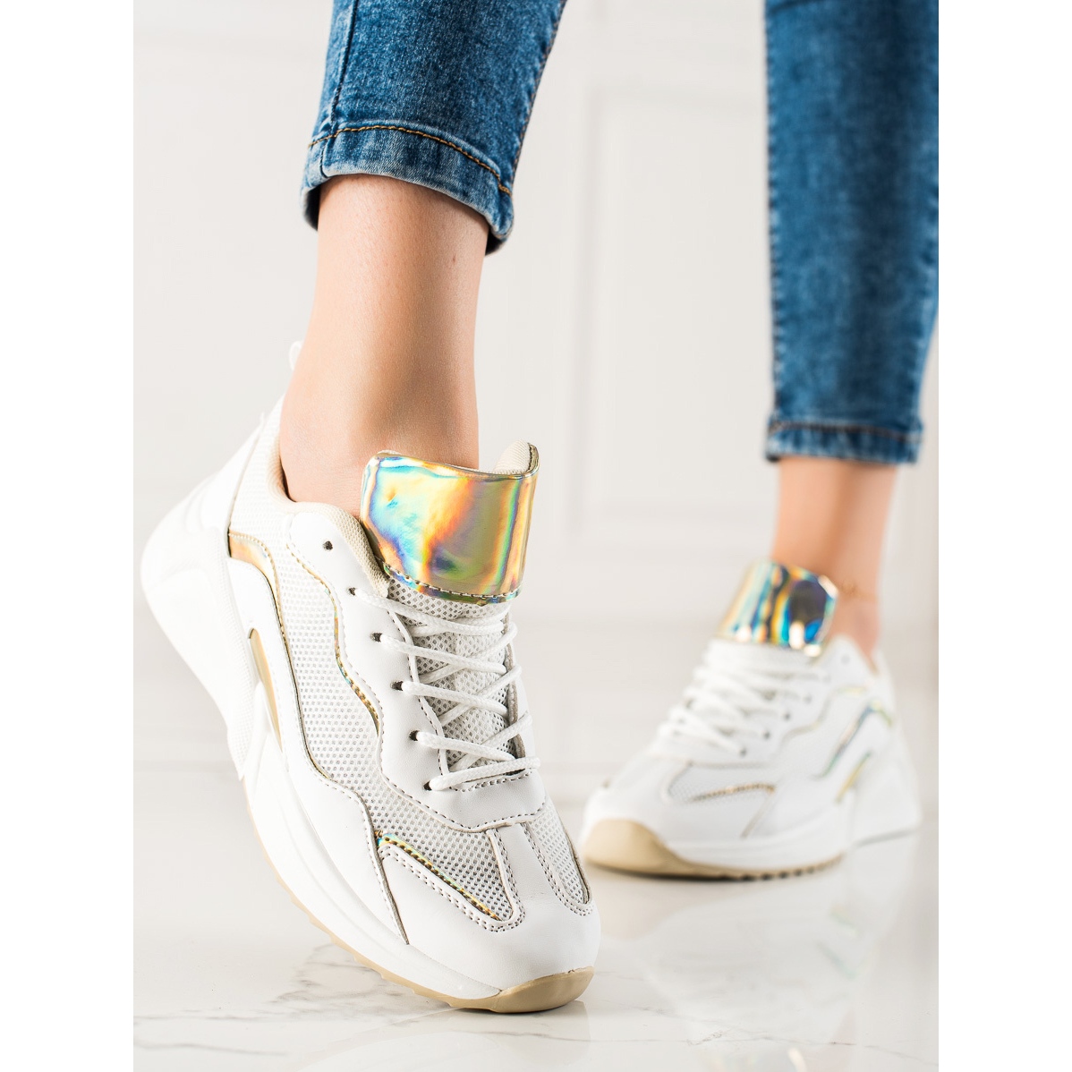 Découvrez votre compagnon idéal pour les aventures quotidiennes avec les baskets tendance avec Holo Effect du fabricant TRENDI. Ces chaussures de sport blanches pour femmes sont une combinaison parfaite de style, de confort et de tendances modernes. Fabriqués à partir de matériaux de haute qualité, ils offrent non seulement une apparence attrayante, mais aussi un confort de port.
