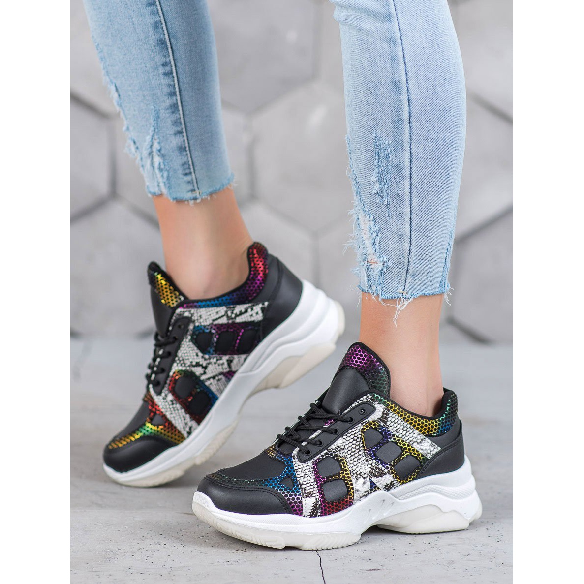 Les baskets sont montées sur une plateforme blanche de 5 cm de hauteur, ce qui non seulement ajoute du style, mais assure également un confort de marche. La semelle crantée en caoutchouc garantit une bonne adhérence, ce qui en fait un choix idéal pour diverses conditions météorologiques, aussi bien en automne-hiver qu'au printemps-été.