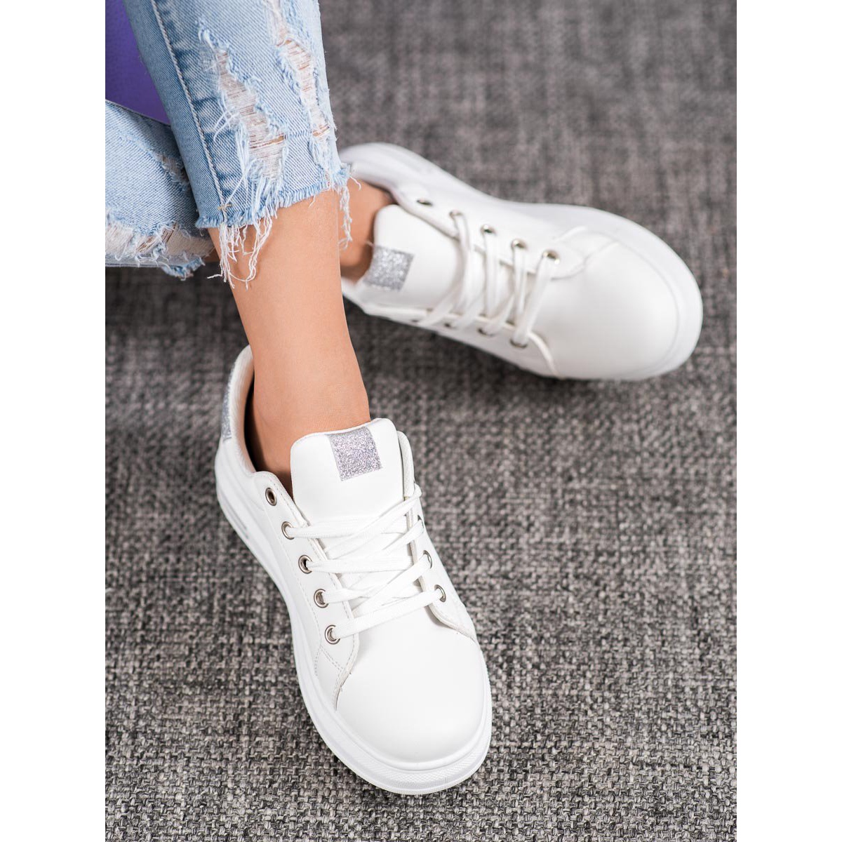 Nous vous présentons les baskets avec inserts pailletés en blanc et gris de la marque SHELOVET - la combinaison parfaite de style et de confort. Ces chaussures uniques sont un incontournable dans la garde-robe de toute femme qui souhaite se démarquer tout en assurant son confort lors des activités quotidiennes.
