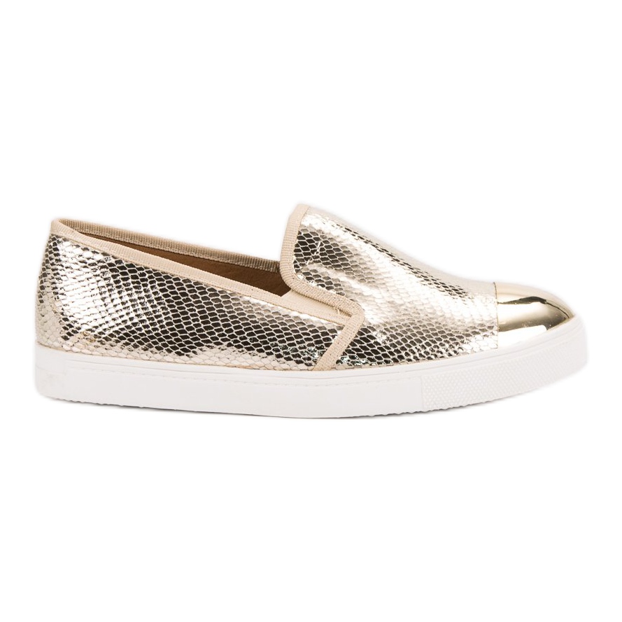 Les baskets Gold Slip On de la marque Queen Bee sont le choix parfait pour les femmes qui veulent se démarquer au quotidien. Leur éclat unique et leur motif animalier unique les rendent difficiles à ignorer. Fabriqués en cuir écologique de haute qualité, ils allient élégance et confort de port.