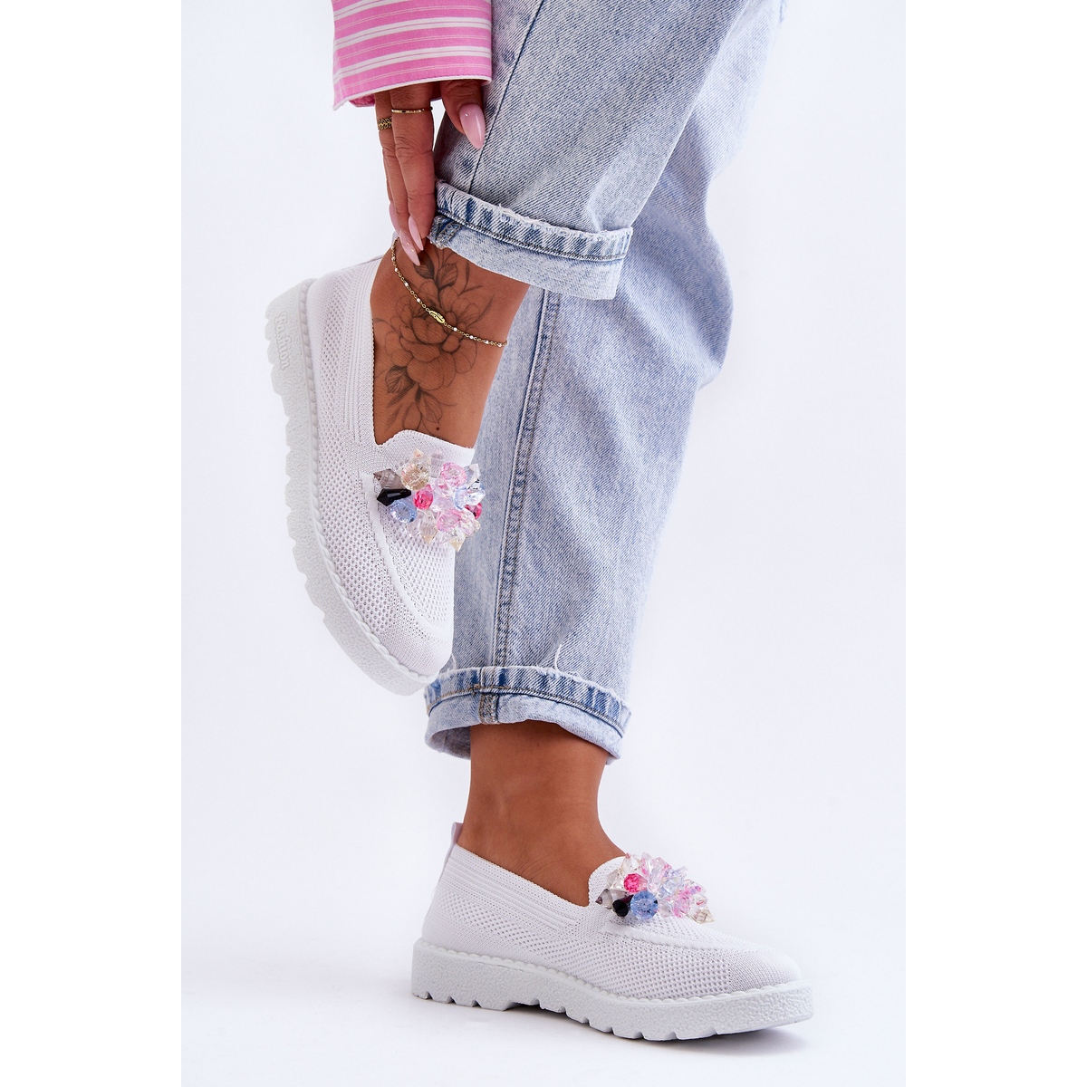 Fabriquées dans un matériau textile de haute qualité, les baskets offrent une excellente ventilation, ce qui les rend parfaites pour les journées de printemps et d'été, mais elles fonctionneront également bien à l'automne. Le devant des chaussures est décoré de jolis strass multicolores qui leur confèrent un caractère et un éclat uniques.