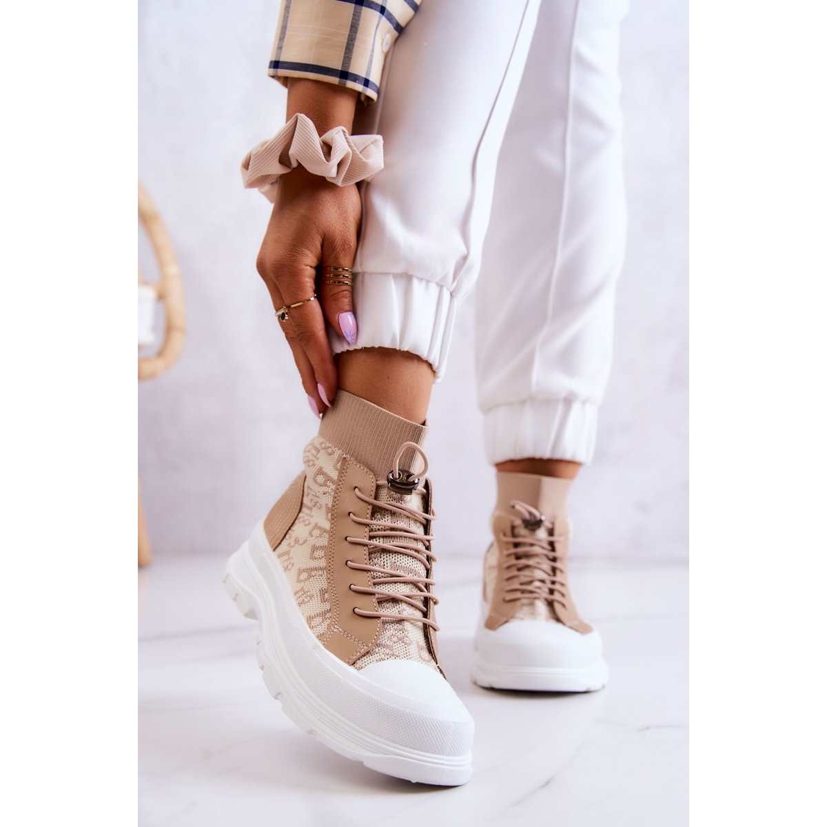 Découvrez la dernière tendance de la mode avec les baskets beiges FW1 Fashionable Sneakers Wysoka Skarpeta. Ces chaussures élégantes pour femmes se distinguent par une tige qui arrive au-dessus de la cheville, en matière textile de haute qualité avec un motif intéressant. Leurs bandes élastiques s'adaptent parfaitement à la largeur de la jambe, ce qui assure un confort de port tout au long de la journée.