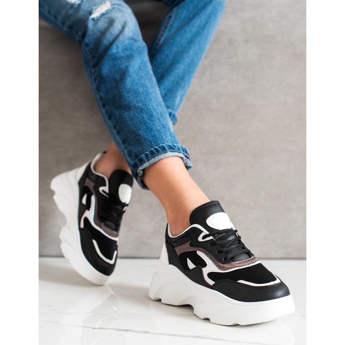Les baskets tendance SHELOVET en blanc et noir sont le choix parfait pour les femmes qui souhaitent allier style original et confort au quotidien. Fabriquées à partir de matériaux de haute qualité, ces chaussures de sport trouveront leur place dans n'importe quelle collection de baskets.