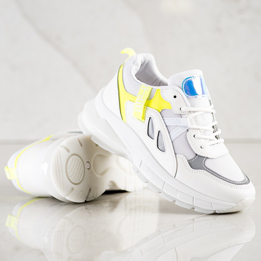 Les baskets présentent des inserts accrocheurs dans des tons de gris qui leur confèrent un caractère moderne. Des éléments décoratifs de couleur jaune intense et des décorations à effet holographique sur le laçage leur confèrent un style unique qui s'adapte parfaitement aux dernières tendances de la mode.