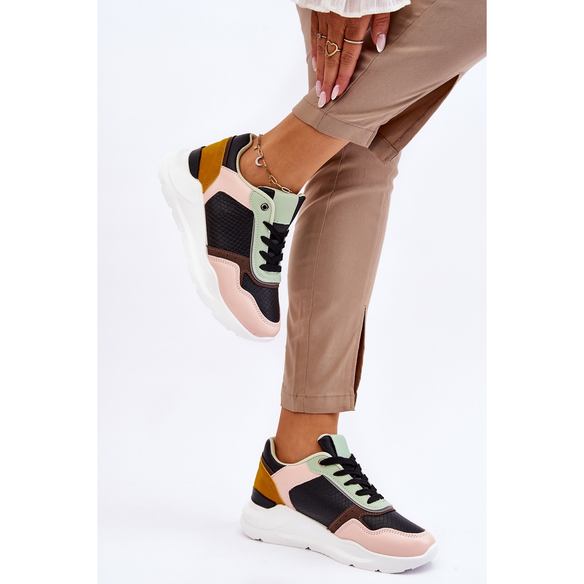 Nous présentons les chaussures de sport à plateforme en cuir pour femmes de la marque PG1 dans une combinaison de couleurs tendance de noir, rose et vert. Ces baskets extrêmement élégantes sont fabriquées en cuir écologique de haute qualité, ce qui les rend à la fois confortables et respectueuses de l'environnement.