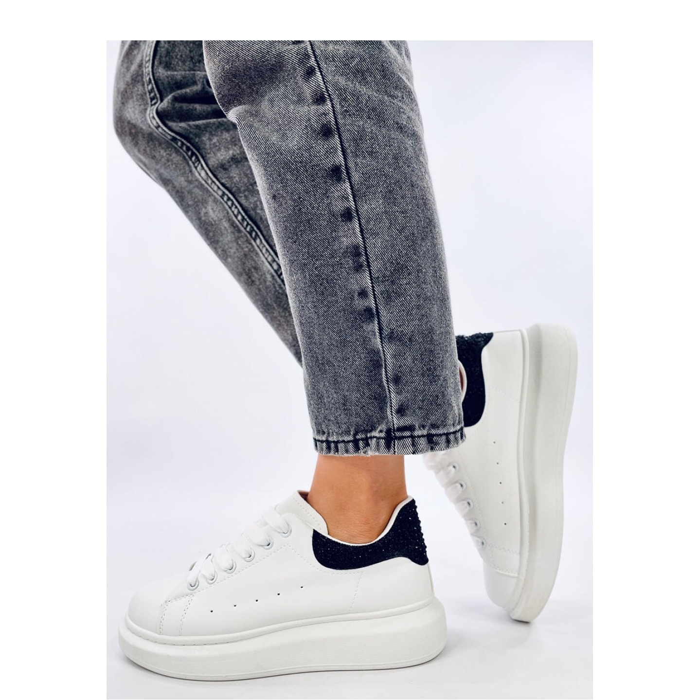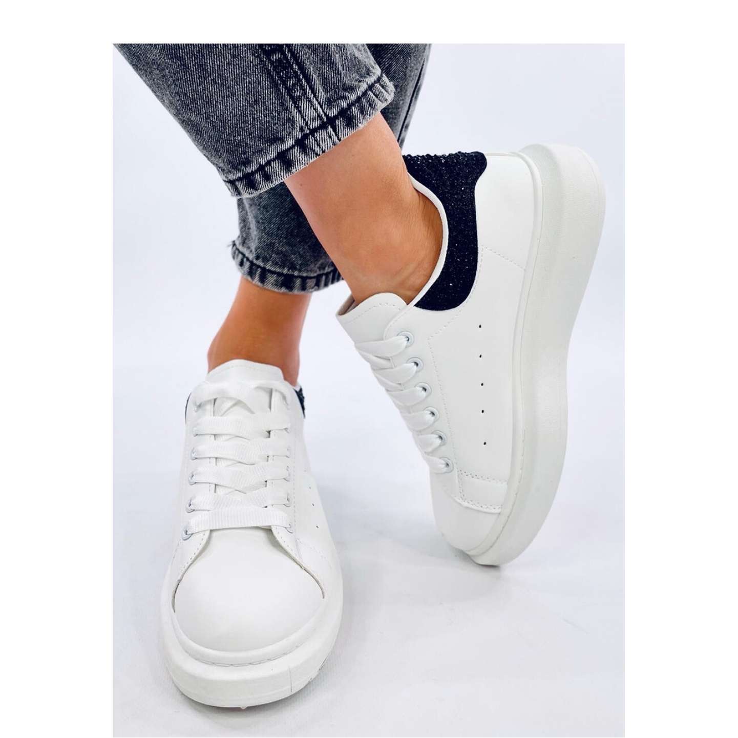 Les baskets sur la plate-forme blanche / noire Parkss du fabricant Inello sont le choix parfait pour les femmes qui apprécient non seulement un look à la mode, mais aussi le confort à chaque étape. Ces chaussures de sport élégantes se distinguent par un design unique, qui attire l'œil grâce aux paillettes insérées avec des zircons.