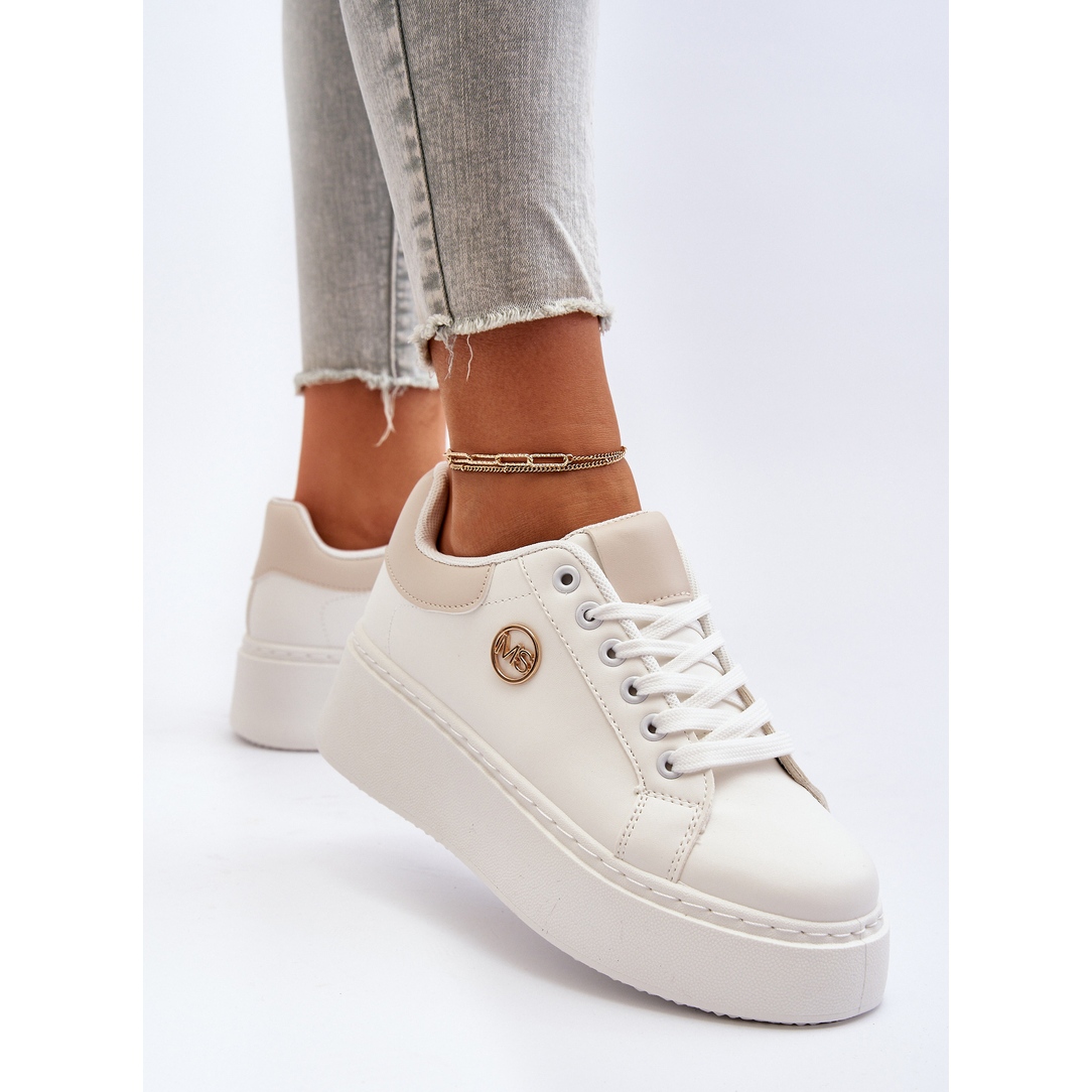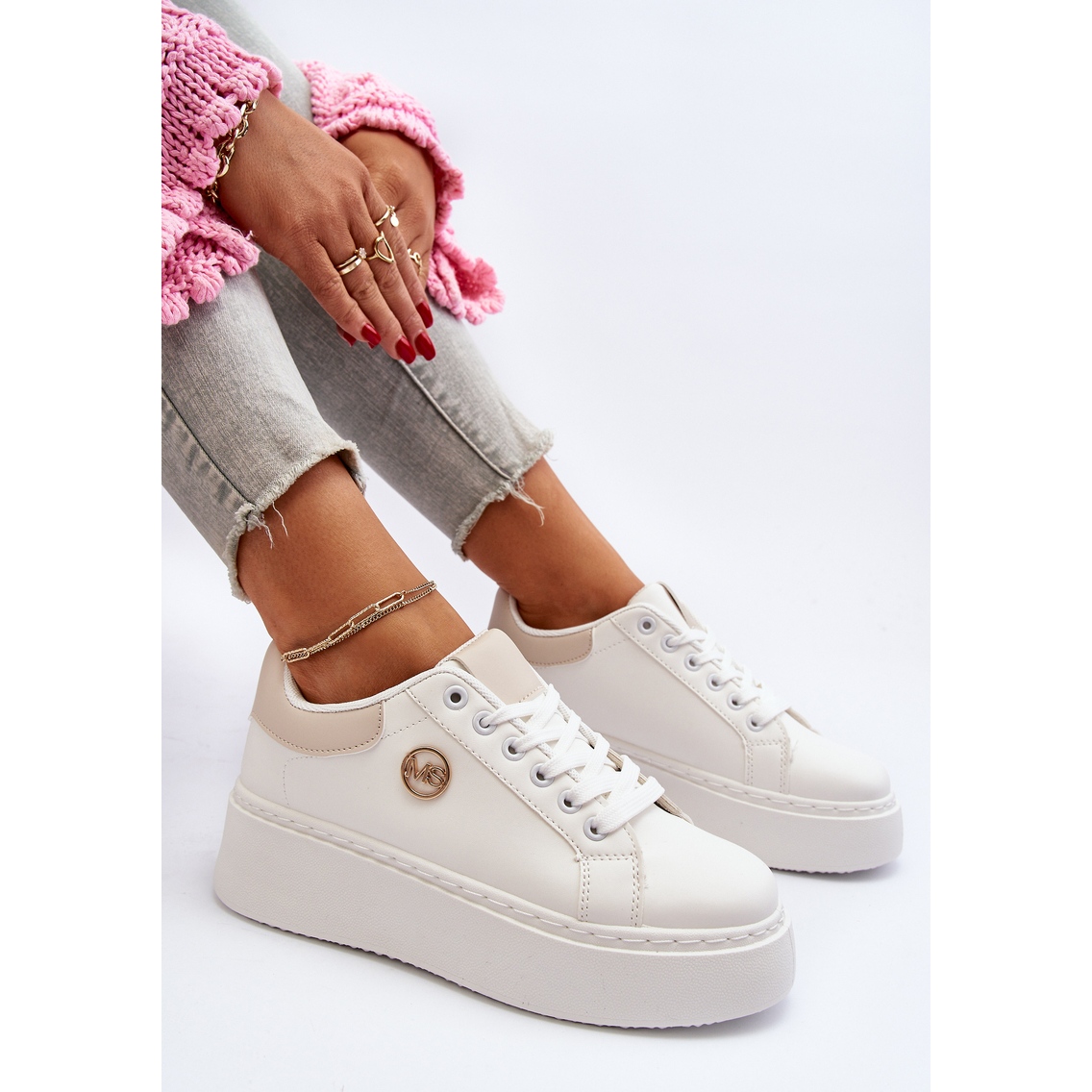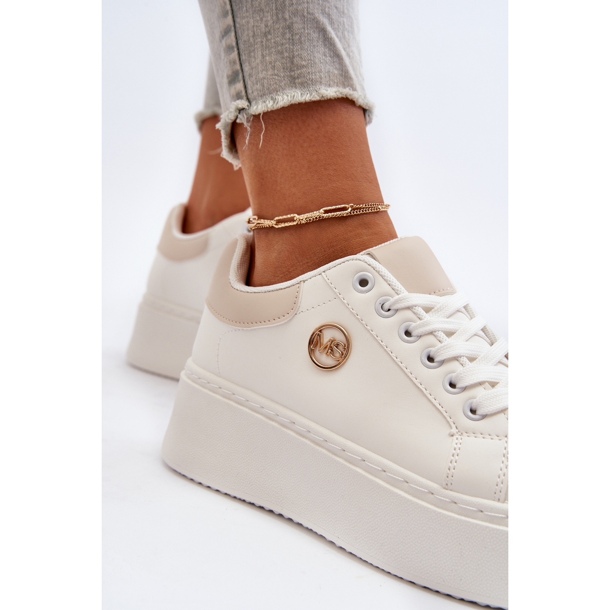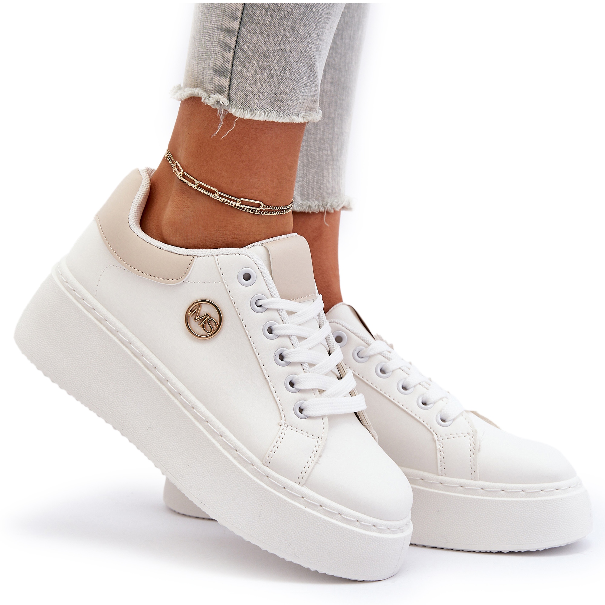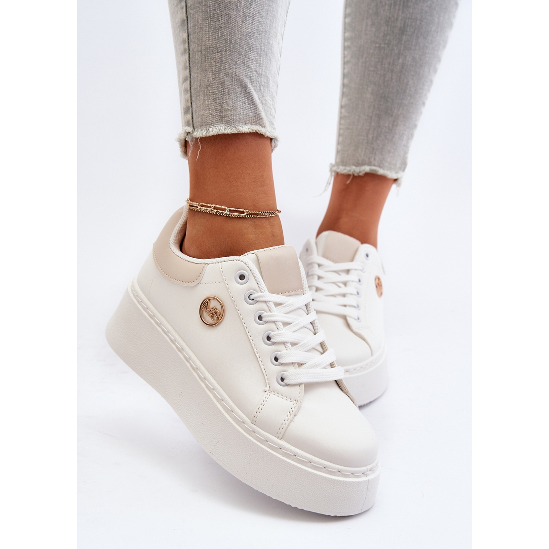 Les baskets se distinguent par un bout arrondi qui souligne leur caractère féminin, et la semelle intérieure en mousse, recouverte d'un matériau doux, assure un confort de port maximal, même dans les conditions les plus exigeantes. Le matériau extérieur en cuir écologique donne aux chaussures un look élégant et la couleur blanche les rend parfaitement assorties à différents styles.
