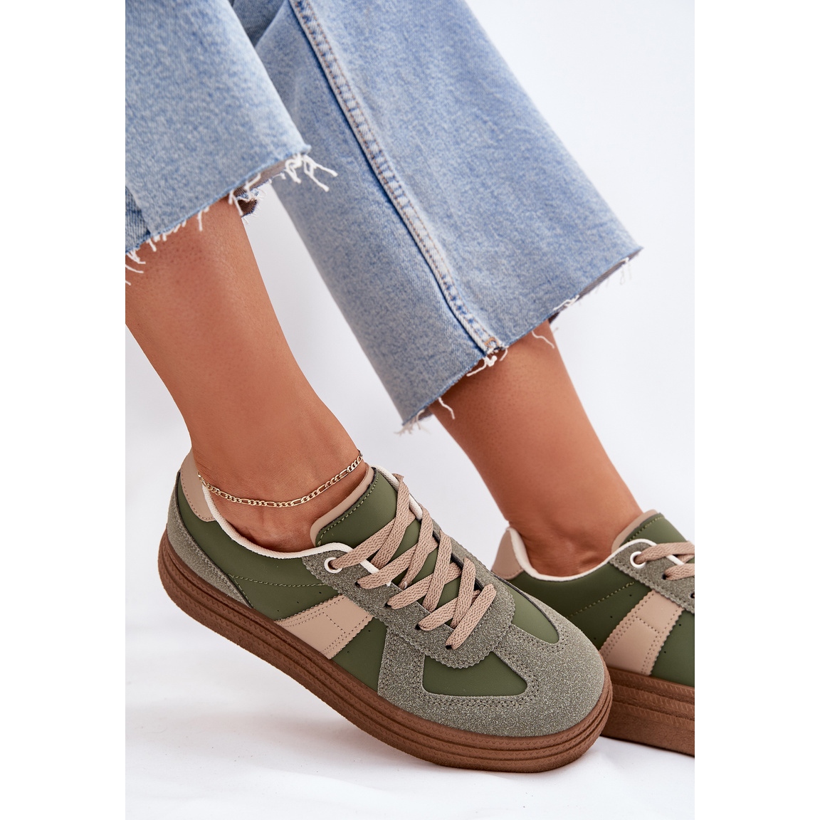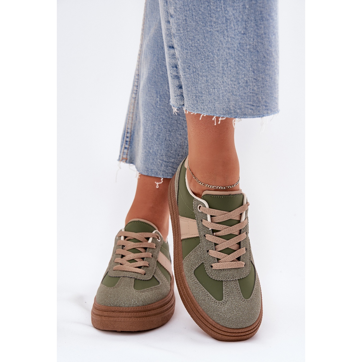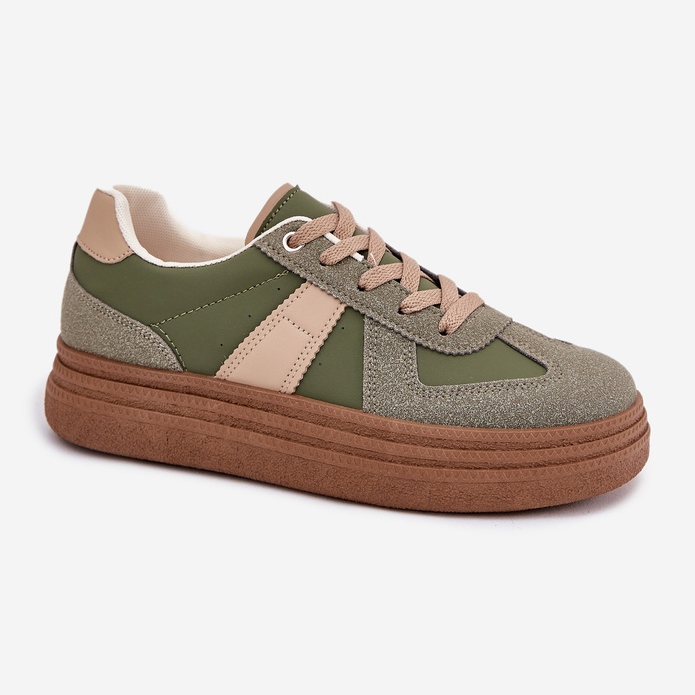 Nous présentons des baskets pour femmes à la mode sur la plate-forme dans une belle couleur verte, qui sera un complément parfait à chaque stylisation quotidienne. Ces chaussures élégantes sont en cuir écologique de haute qualité, ce qui les rend respectueuses de l'environnement et en même temps extrêmement durables.