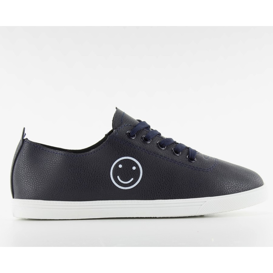 Charmantes baskets basses pour femme en cuir écologique pleine fleur. La couleur bleu marine classique et un visage délicat et souriant sur le côté leur confèrent un caractère légèrement ludique et à la fois universel. Une semelle intérieure en tissu doux et une fermeture à lacets assurent confort et ajustement tout au long de la journée.