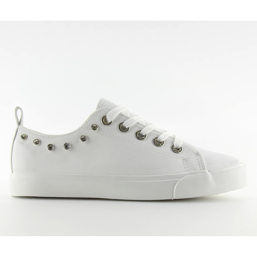 Baskets basses classiques pour femmes avec des zircons impressionnants qui décorent tout le devant de la chaussure, même les passants de ceinture. Le modèle parfait pour celles qui souhaitent ajouter de la brillance à leur style de tous les jours. Tige en cuir écologique, intérieur doublé de tissu pour un port confortable. La semelle en caoutchouc offre une bonne adhérence et la plateforme/talon bas (2 cm) vous permet de rester à l'aise toute la journée. Le produit comporte des clous décoratifs supplémentaires.