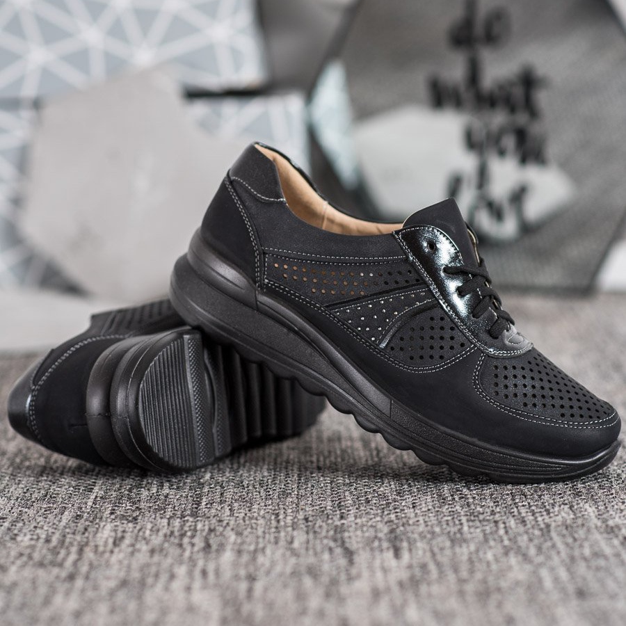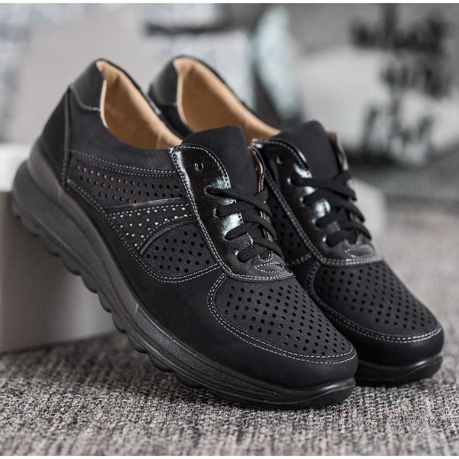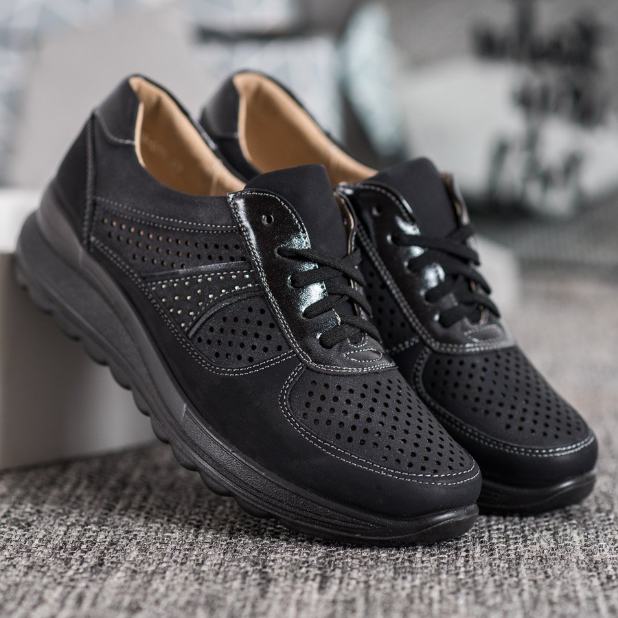 Nous vous présentons les baskets ajourées sur la plateforme en noir élégant du fabricant Comer. Ces chaussures de sport pour femmes sont le choix parfait pour les femmes qui apprécient le confort et le style au quotidien. Avec leur aide, vous créerez des tenues décontractées mais à la mode qui seront parfaites pour le printemps et l'été.