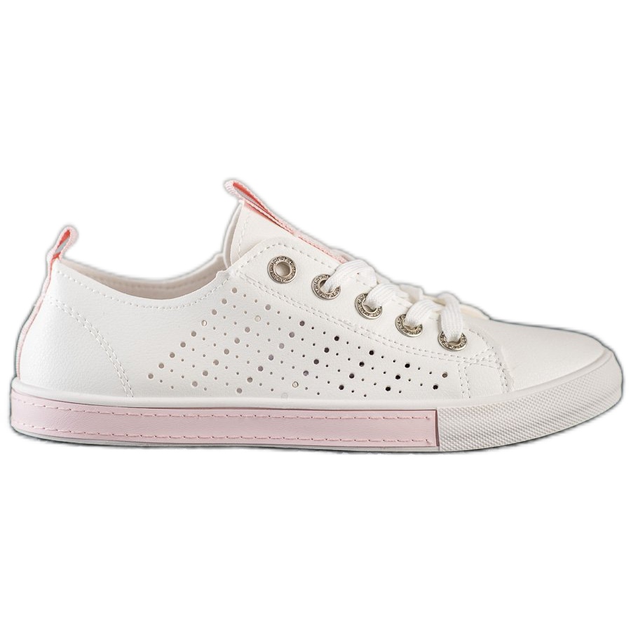 Ces baskets se caractérisent par une couleur blanche intemporelle qui se marie parfaitement avec diverses combinaisons. Le motif ajouré ajoute originalité et légèreté, s'adaptant parfaitement aux tendances du printemps et de l'été. La semelle avec bande de roulement en plastique assure stabilité et confort lors des promenades quotidiennes.