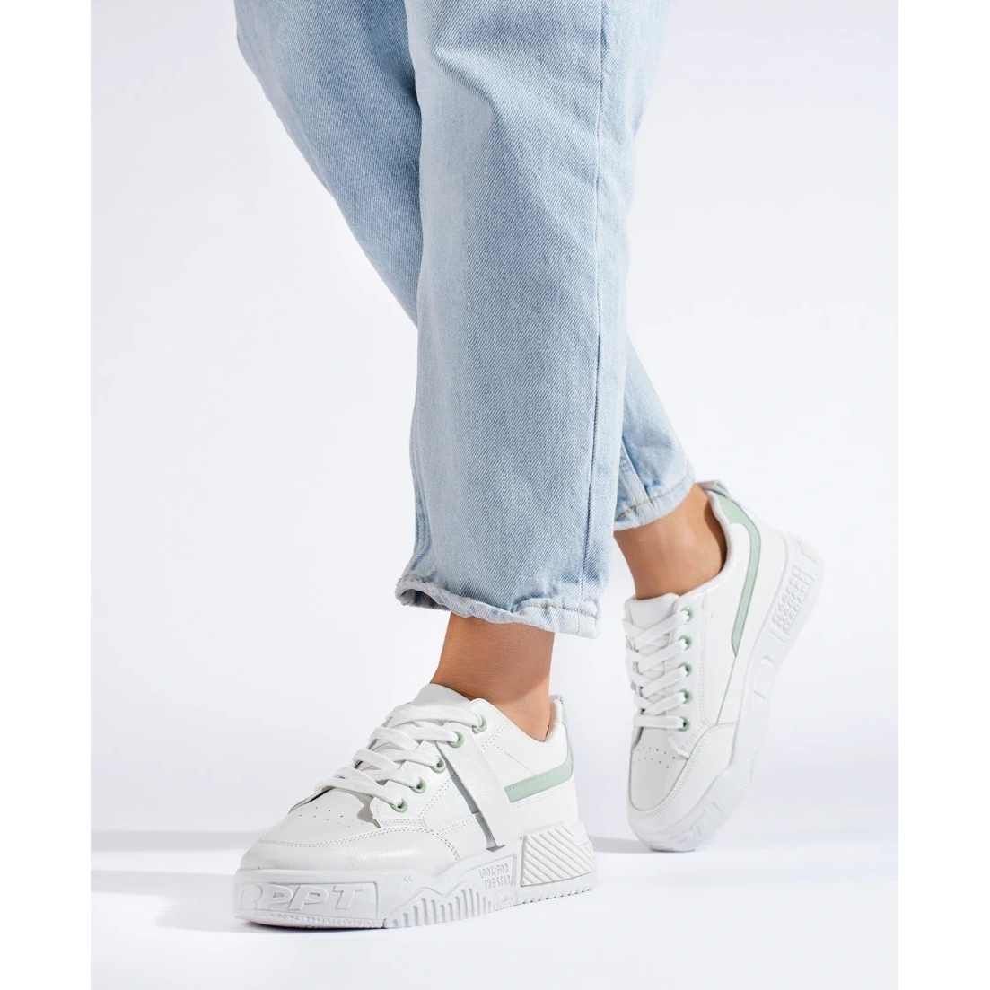 Les sneakers modernes et universels de la collection Keeshoes sont une proposition pour les femmes qui apprécient le confort et un look à la mode et décontracté. Fabriqué en cuir écologique en blanc classique, ils combinent un style sportif avec une plate-forme subtile (environ 4 cm), qui allonge optiquement la figure, sans renoncer au confort chaque jour.
