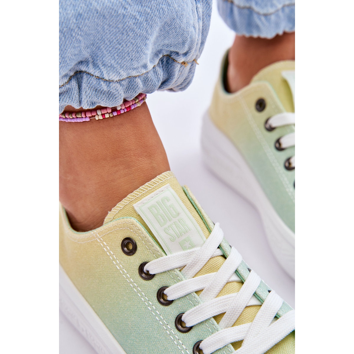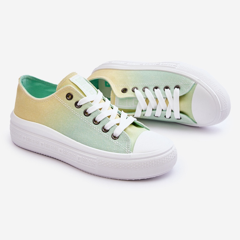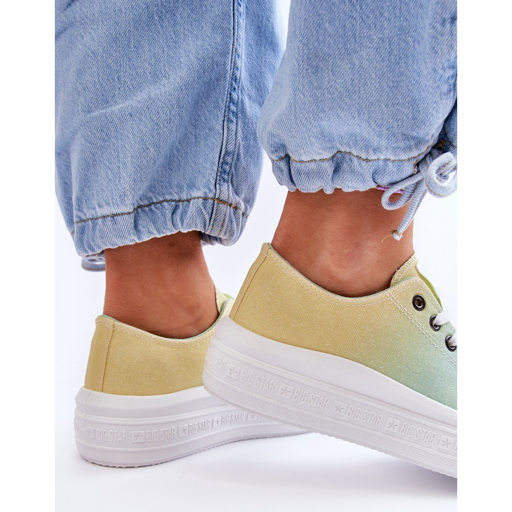 Ce produit est une sneaker basse pour femme de BIG STAR. Les chaussures sont disponibles dans des couleurs jaune vif et vert qui s'entrelacent dans un style ombré. La partie extérieure des chaussures est en tissu, tout comme la semelle intérieure, ce qui garantit un confort de port. La couleur de la semelle est blanche et la semelle elle-même est en caoutchouc.