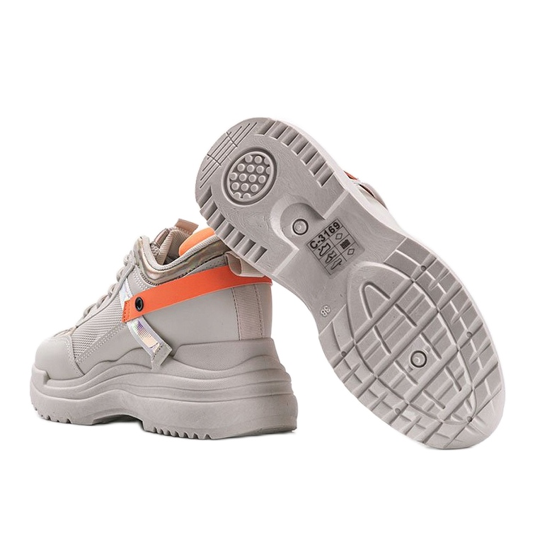 Les baskets sont équipées d'une cale cachée de 9 cm de haut, qui non seulement ajoute quelques centimètres de hauteur, mais met également en valeur la silhouette à merveille, la rendant plus fine. Les empiècements orange originaux sur la tige attirent l'attention et donnent du caractère aux chaussures.