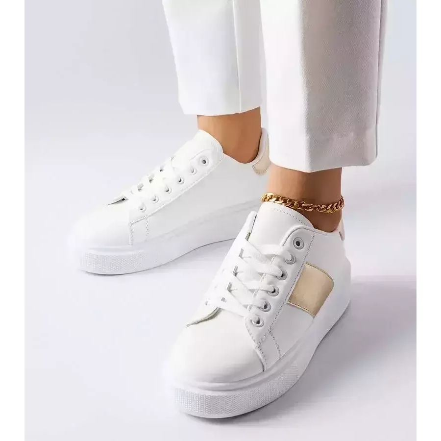 Laissez-vous surprendre par le design léger et mode des baskets blanches à bride dorée d'Aurélie ! Ce modèle sportif est le complément parfait à tout style, à la fois quotidien et plus élégant. Grâce à la semelle épaisse, très appréciée cette saison, vous élèverez votre confort et votre style à un tout autre niveau.