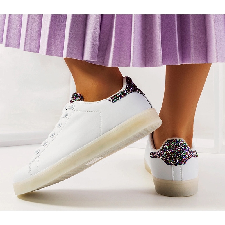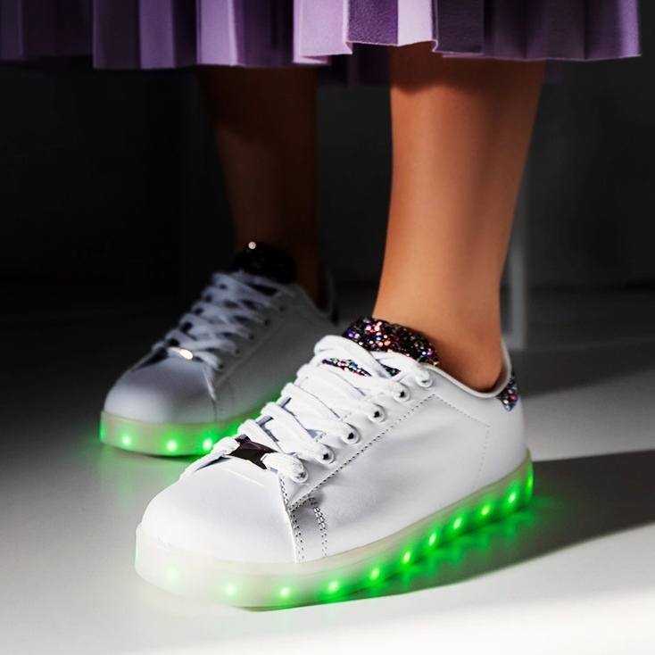 La tige en cuir écologique avec des inserts pailletés ajoute de l'élégance, et la semelle brillante en fait un élément extrêmement distinctif de n'importe quelle tenue. Grâce à la possibilité d'allumer et de changer les couleurs des lumières à l'aide d'un bouton, vous pourrez les adapter à votre humeur ou à votre occasion.