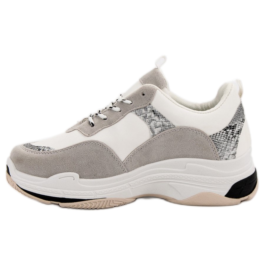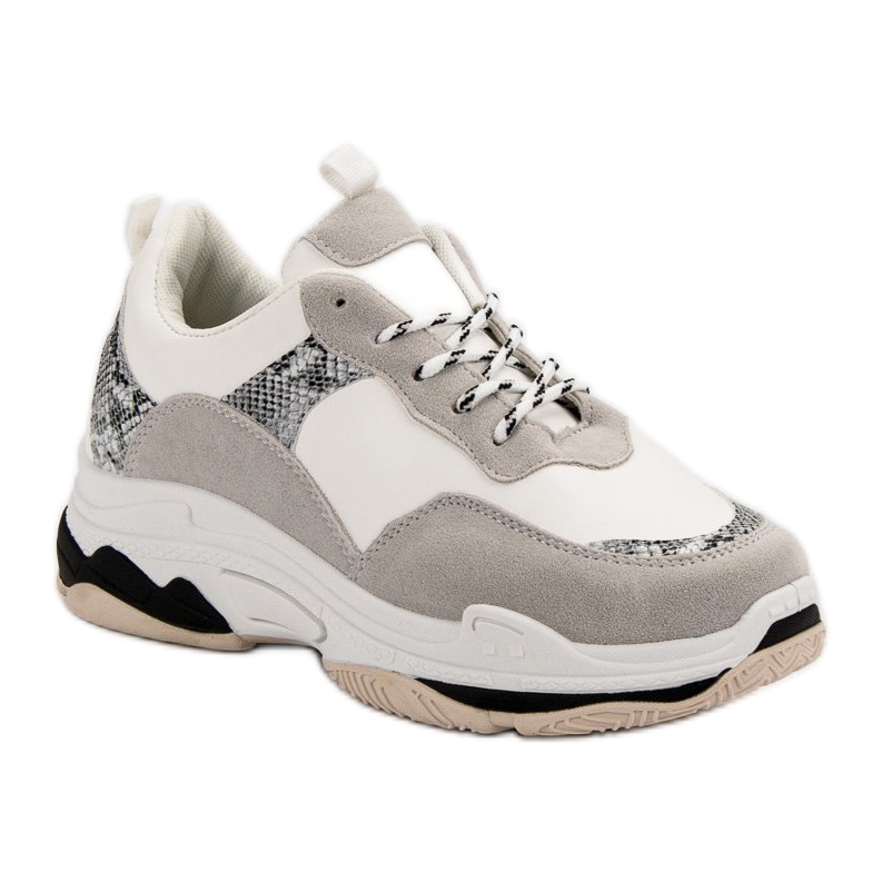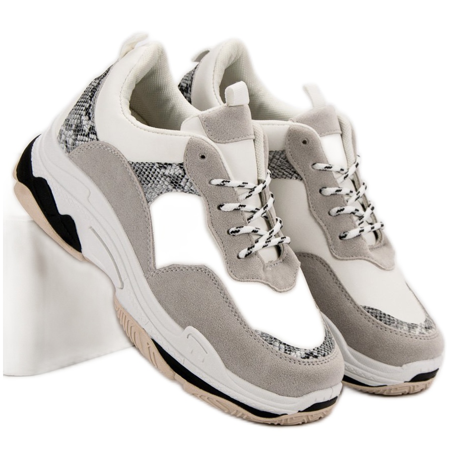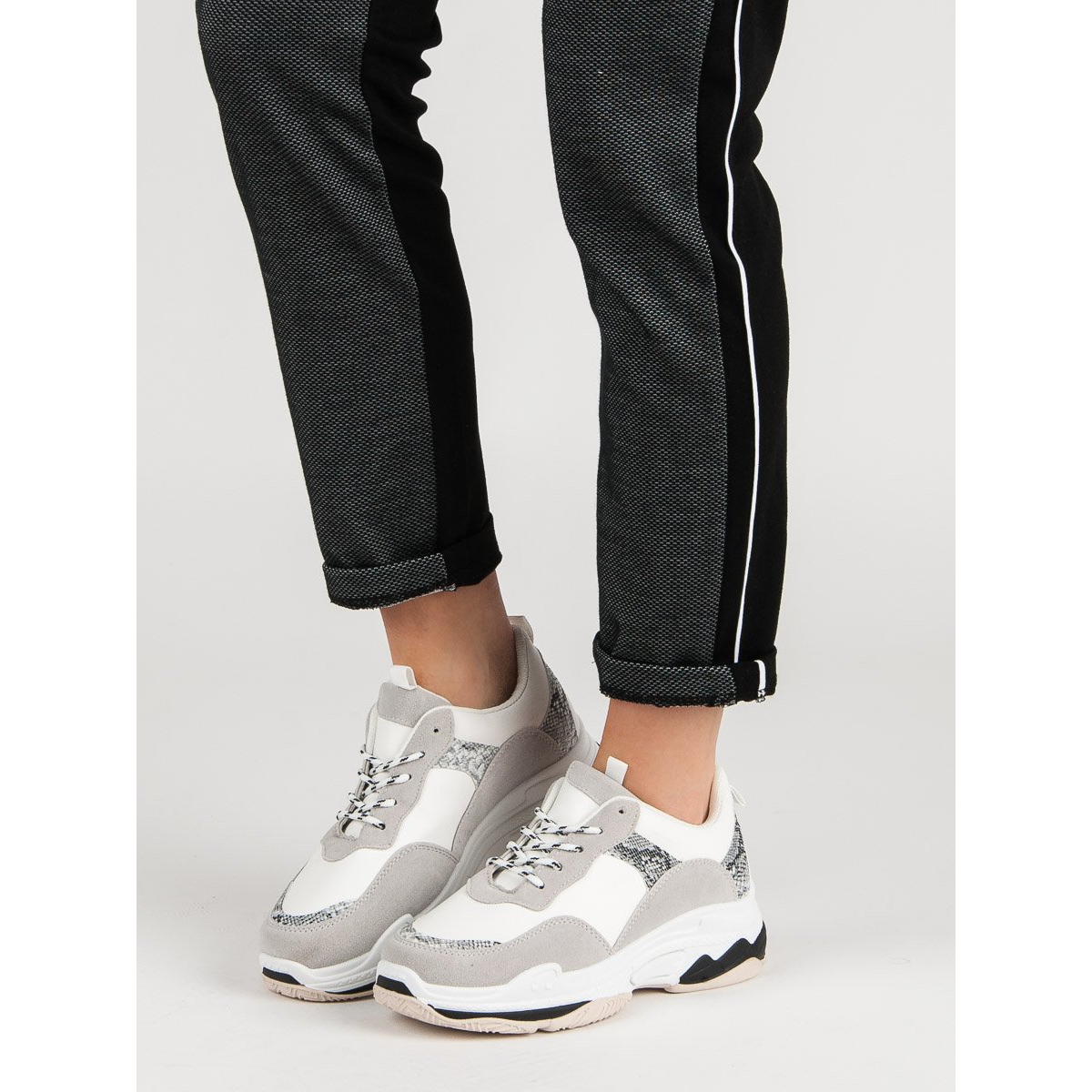 Découvrez une option élégante et sportive pour chaque occasion : des baskets blanches avec un motif dans les tons noir et marron. Ces chaussures uniques, composées d'une combinaison de cuir écologique imitant le daim et de cuir naturel, allient parfaitement design tendance et confort de port. Leur style unique est souligné par des applications brillantes placées sur les côtés et au dos, qui leur confèrent un caractère original.