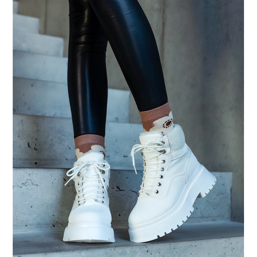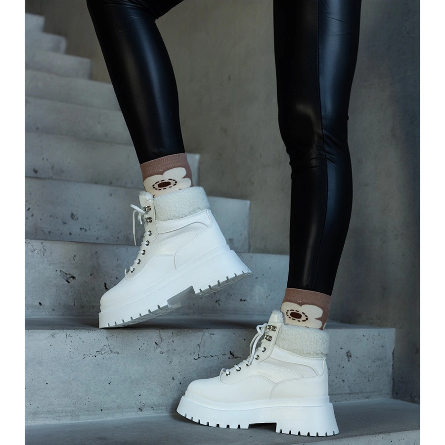 La semelle épaisse en caoutchouc ajoute non seulement du style, mais offre surtout une excellente adhérence et un excellent amorti, ce qui en fait un choix idéal pour un usage quotidien. Le bout rond souligne le design moderne et la couleur blanche permet à ces bottes de s'adapter à une variété de styles.