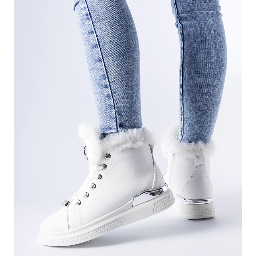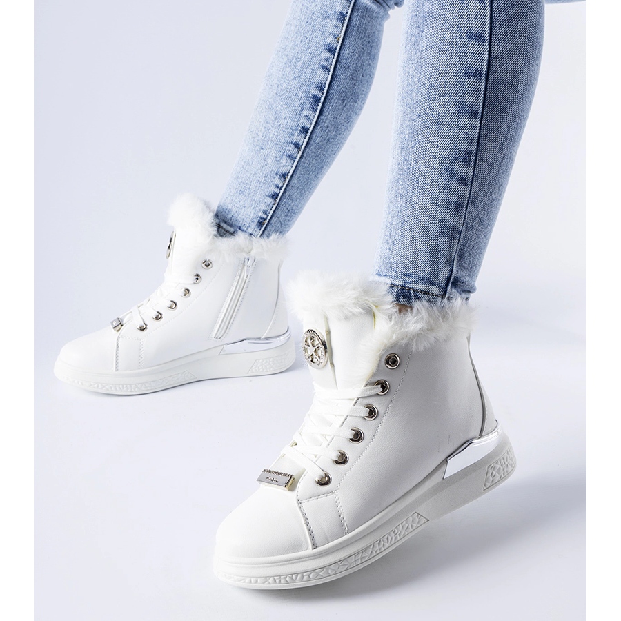 Les baskets Lubriano élégantes et intemporelles en blanc combinent le style urbain avec le réchauffement fonctionnel. Fabriqué en cuir écologique de haute qualité, avec une fourrure blanche douce à l'intérieur, ils travailleront les jours les plus froids, assurant le confort et l'apparence à la mode. La coupe haute atteignant la cheville et la plate-forme donnent à la figure un caractère moderne.