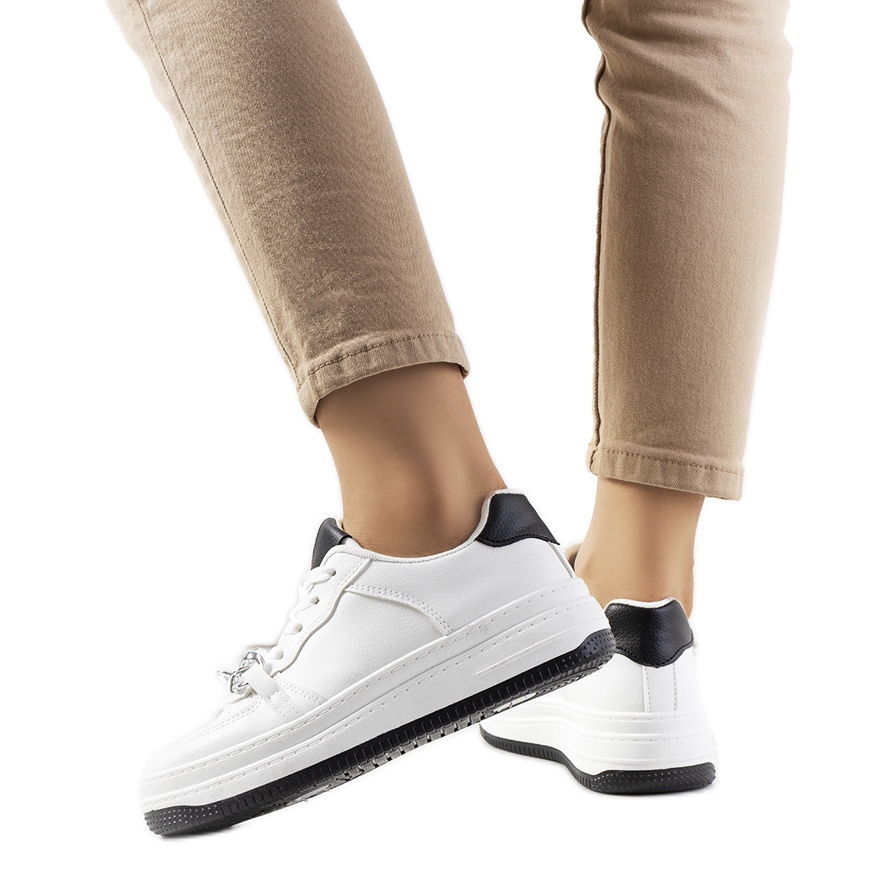 Des baskets blanches élégantes Mary sont une proposition idéale pour l'été - ils combinent une semelle à la mode et surélevée avec une coupe basse classique. Fabriqué en cuir écologique de haute qualité, avec une chaîne décorative qui leur donne du caractère et en fait un accent distinctif de chaque stylisation.