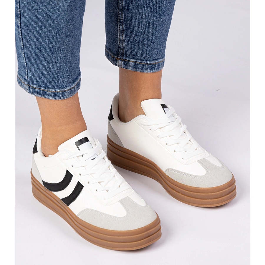 Les baskets blanches avec un ajout noir sont une proposition qui s'adaptera facilement à de nombreux styles. Grâce à la plate-forme de 4 cm de haut, vos jambes seront plus minces et vous vous sentirez spécial à chaque instant de port. La semelle en plastique brune garantit la durabilité et l'excellente adhérence, ce qui fait de ces baskets le choix parfait pour les promenades en ville et pendant les activités sportives.