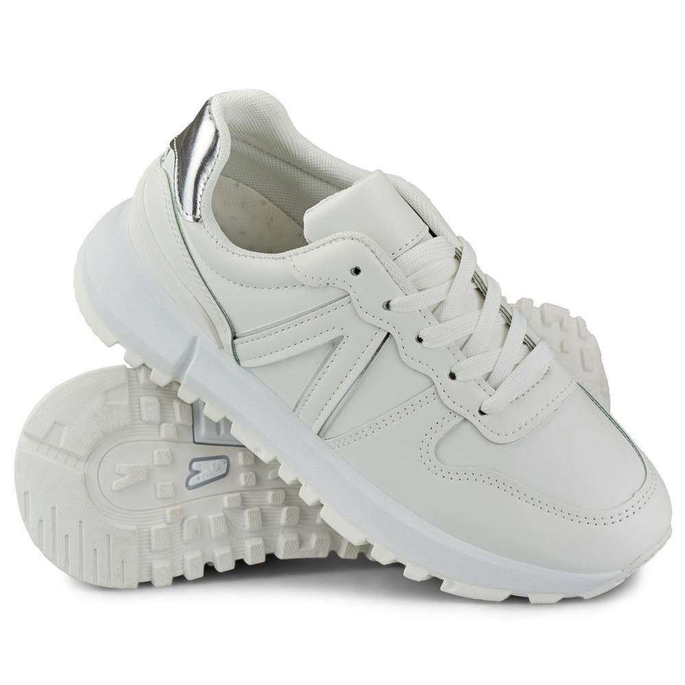 Le produit est des baskets blanches pour femmes en cuir écologique. Les chaussures sont décorées de passepoils argentés, qui ajoutent élégance et style. Ce produit provient du fabricant "Autre Marque" et fait partie de la collection "KeeShoes".