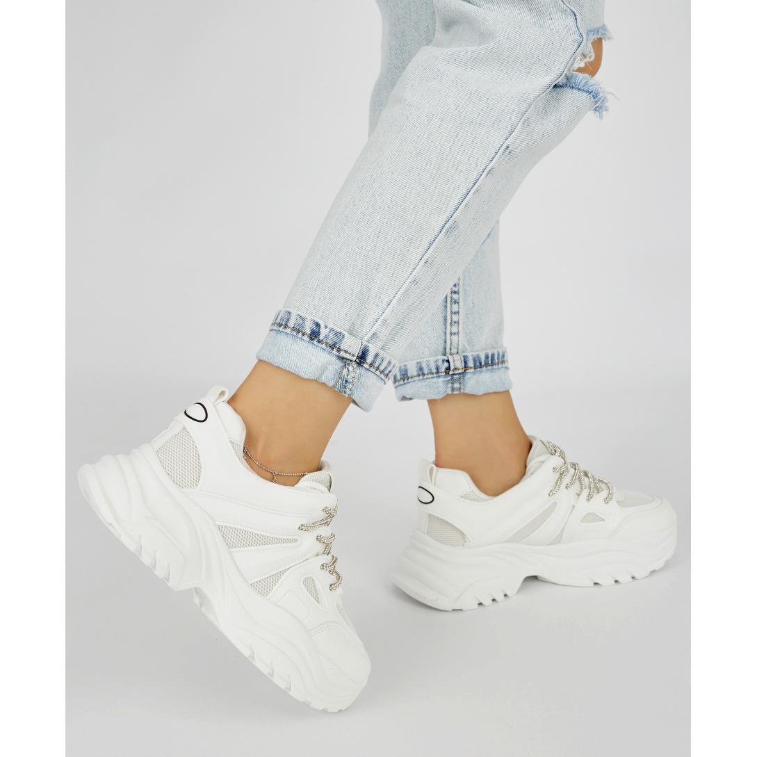 Vous recherchez des chaussures qui correspondent à la fois à des sports et à des stylisations décontractées? Ces baskets blanches répondront certainement à vos attentes! Grâce à la plate-forme de 5 cm de haut, vous pourrez profiter de confort et de confiance supplémentaires. La fixation sous la forme de lacets permet un ajustement facile au pied, et leur couleur blanche en fait un complément parfait à chaque garde-robe.