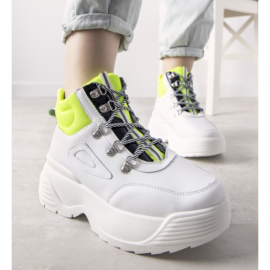 Les baskets à semelles hautes Eloquence sont un choix parfait pour les journées plus froides, alliant confort et design tendance. Fabriquées en cuir écologique de haute qualité, ces chaussures blanches se distinguent par des empiècements élégants d'une couleur vert fluo inhabituelle qui mettent parfaitement en valeur la cheville.